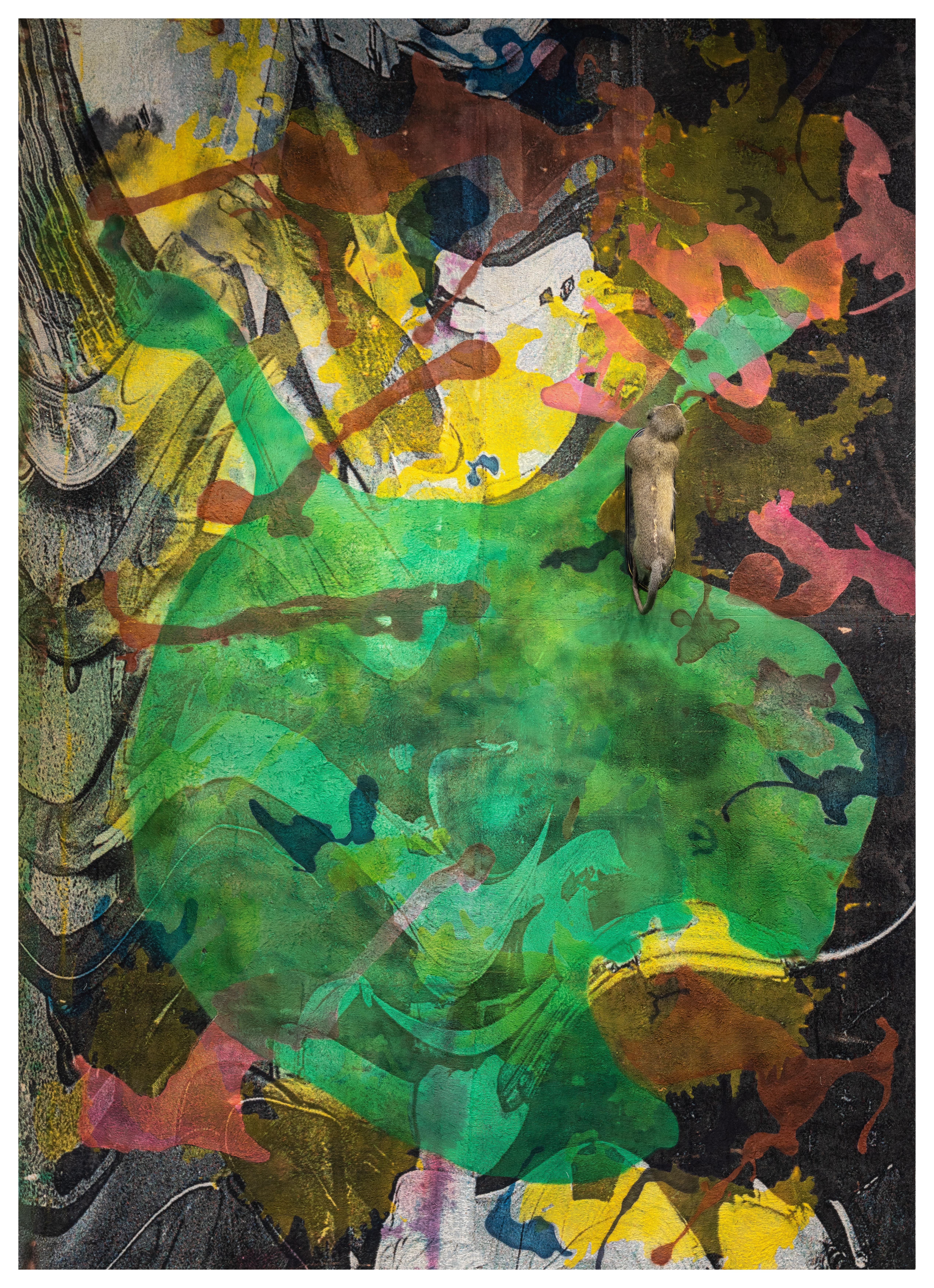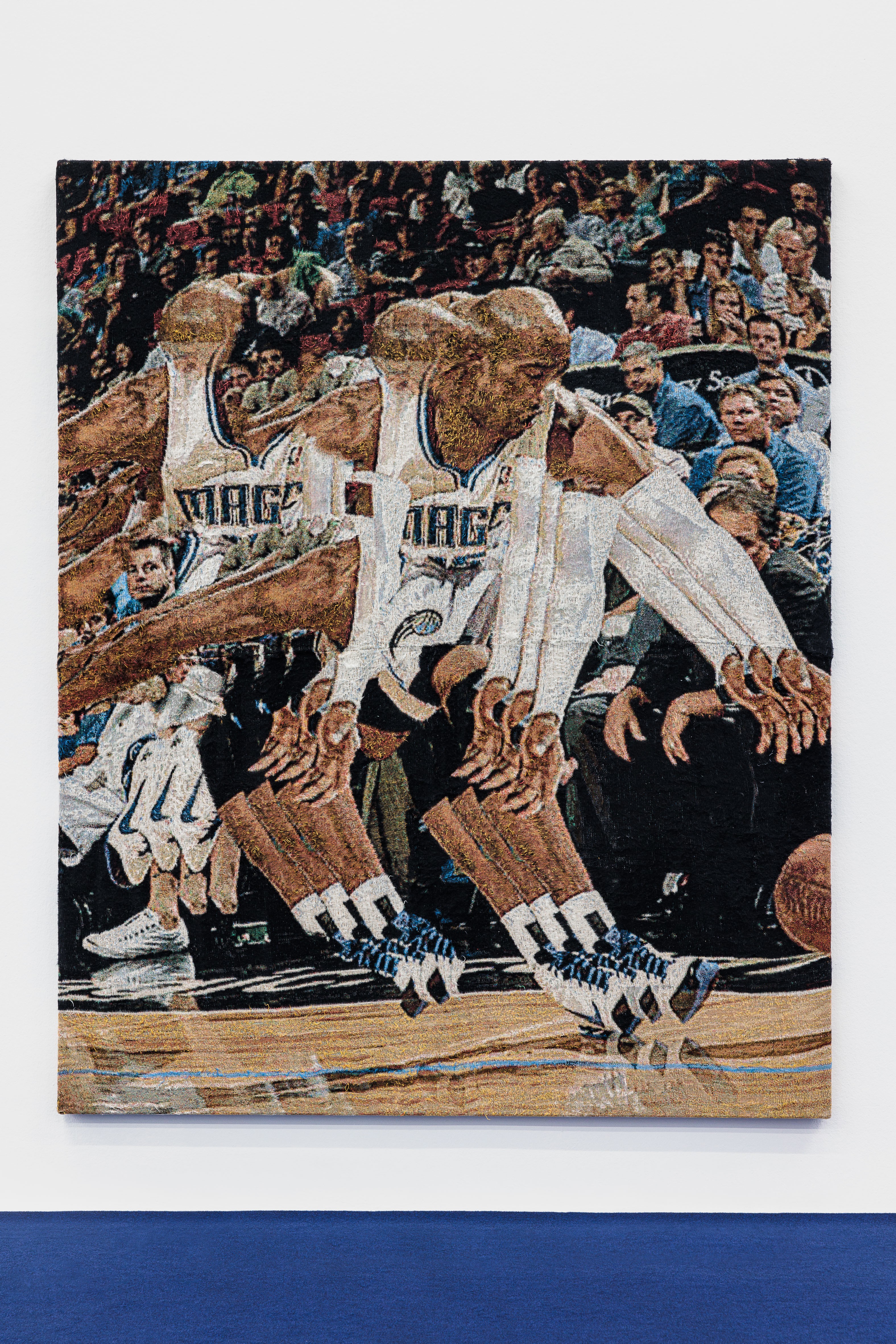 I manipulate images to appear to hold a televisual glitch (ghosting and vertical roll). For me, this marks a disruption in communication—a vertical roll occurs when the receiving and transmitting frequencies are ‘out of sync.’ My woven images assume the televisual dance of the vertical roll and the trauma superimposition of a ghost. (hor)Rorschach (D0wnw0rd D0g) (2019-2023) weaves a photograph of the arrest of a group of Black men during the Watts Riot/Revolution (1965). Composed as a diptych, physically distressed, and treated with a mix of dye and paint, the central floral pattern reflects the psychological test carried in the title, Rorschach. With this in mind, and cotton as its field, the psychological consequences are woven into the image. While in works like imag/e/mag mag (2023), NBA legend Vince Carter is seen with multiple arms, both fulfilling colonialism’s expectation of black labour, and rehearsing and recalling the enslaved labour associated with the tapestry’s material—cotton.