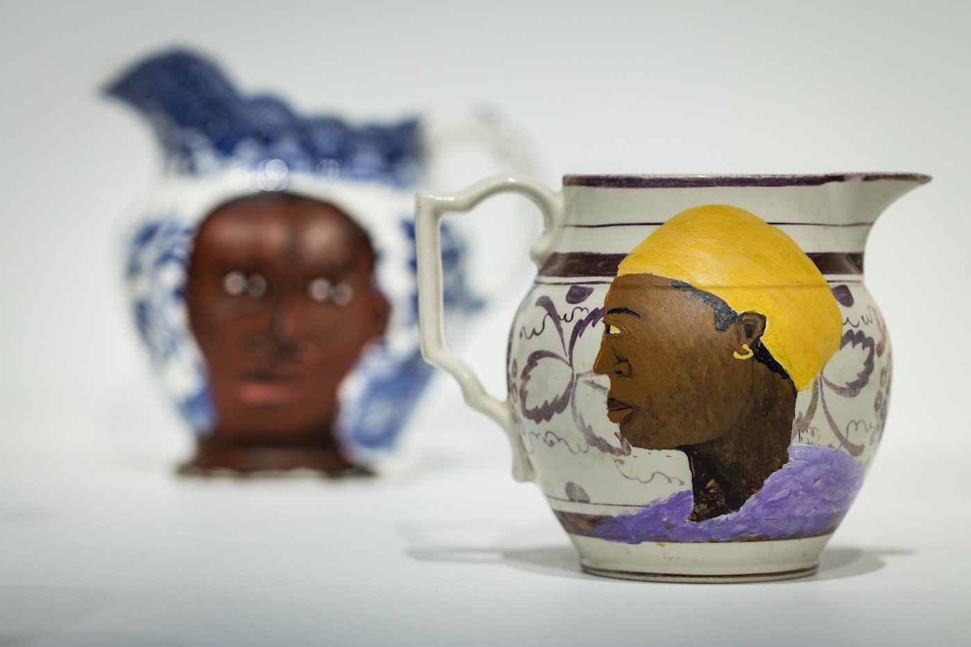 Lubaina Himid has dedicated much of her professional and curatorial life to making Black artists and specifically Black female artists more visible, but here in Hull she is very literally representing Black lives, by for example overpainting porcelain dinnerware with the images of slaves that would have been the ones using them to serve food, or by isolating racist stereotypes in newspaper clippings from the Guardian, or through her larger than life cut-outs of Black servants in A Fashionable Marriage. As Himid puts it: “I was trying to make places and spaces where we could see ourselves, but also where we could be seen.”