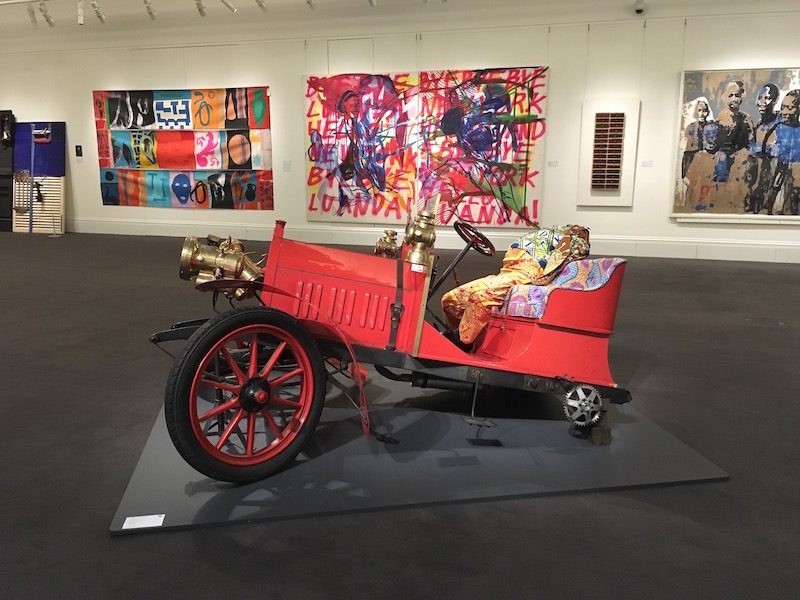 <figcaption> Yinka Shonibare’s Crash Willy and works by Ouattara Watts, António Ole, Francisco Vidal, Willem Boshoff, and Armand Boua at the Sotheby’s Modern and Contemporary African Art Sale Exhibition, London, May 2017 © Patricia A. Banks