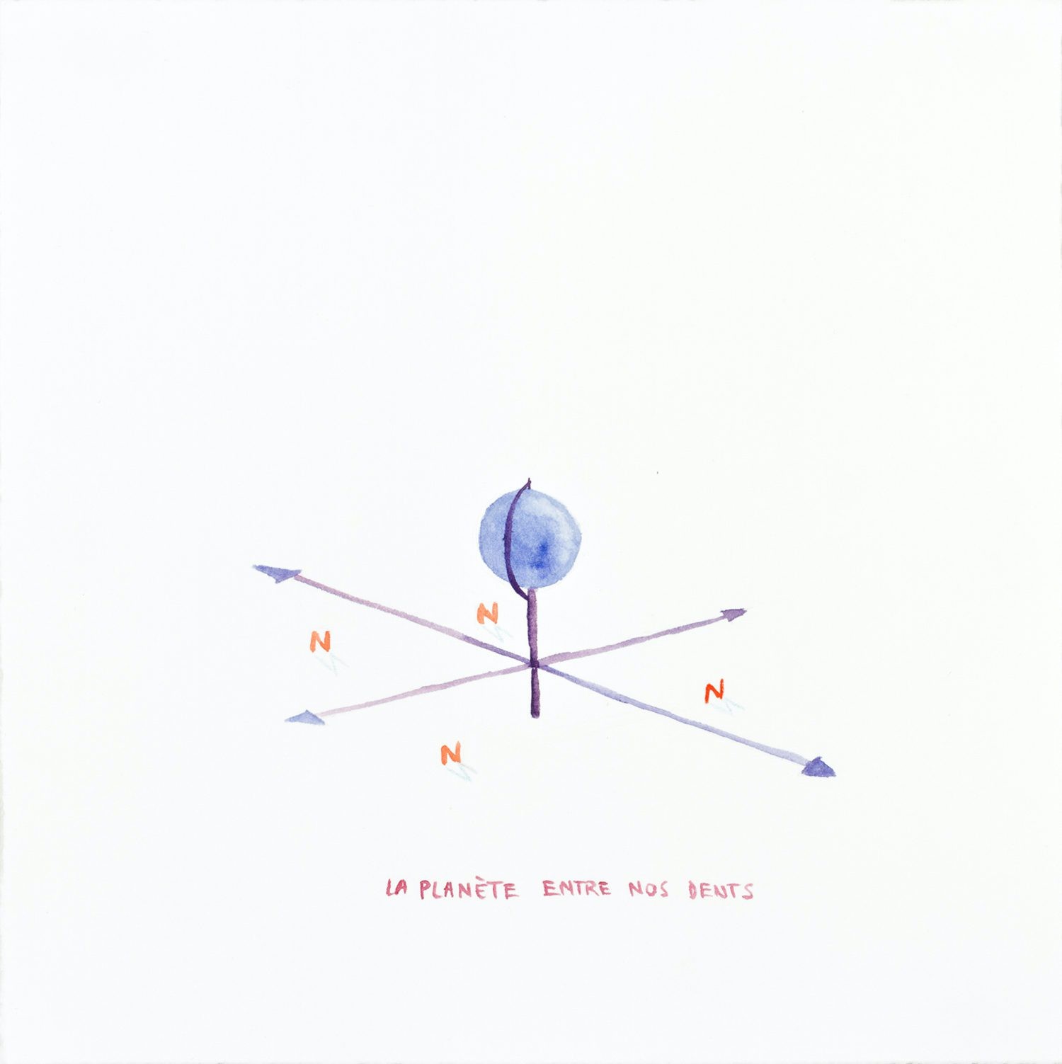 <figcaption> Massinissa Selmani, la planete entre nos dents, 2021. Watercolor, coloured pencil on paper, 22 x 22 cm. © ADAGP Paris - Courtesy Galerie Anne-Sarah Bénichou, Paris.