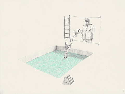 C&: How do you construct your artworks?MS: Lots of my artworks come from fragmented newspaper photographs. I cut, juxtapose, draw on, and reproduce them in my sketchbook and the preparatory drawings. There are recurring elements or figures in my drawings, like, for example, military uniforms or, more recently, cactuses because it is funny to draw, and for me, this is enough to include it in a drawing. I draw enigmatic and ambiguous situations mixing comedy and tragedy. My practice consists of what I call “drawn forms,” aesthetic and graphic articulations that represent the unspeakable and often impossible. The architecture of the composition as a form of tale is also a fundamental element in my work. However, I ask the viewer to make an effort, and not everything is delivered.