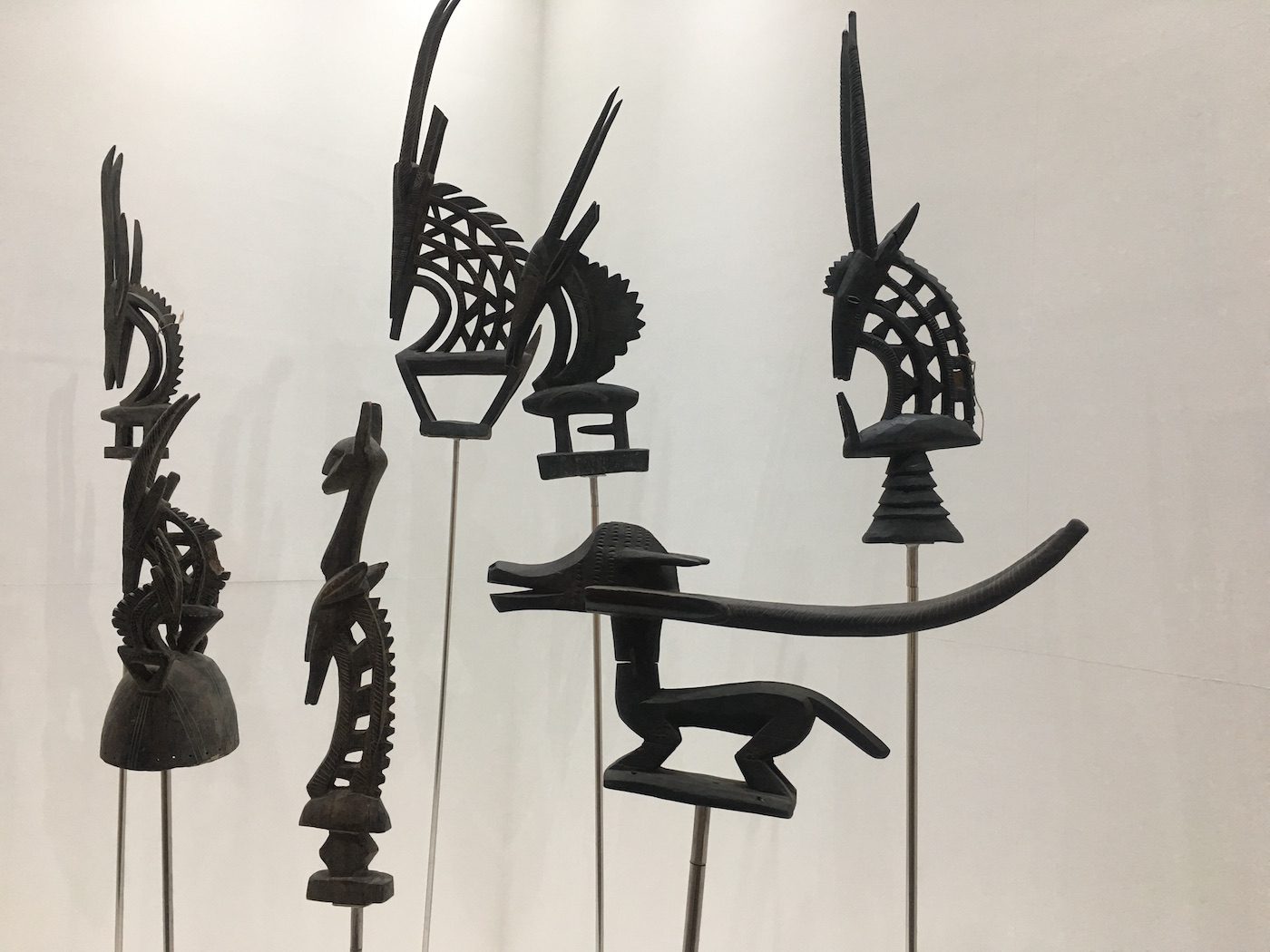 <figcaption> Installation view of the 19th-century wooden Bambara masks from Mali. Photo: Maya Varichon