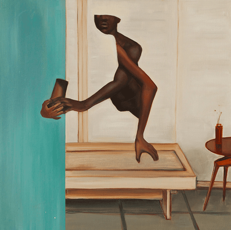 In Fixture of Fantasy (2019), a woman’s black skin is again limned amid taupes and creams. Above her delicately painted lips, her body simply ends. Ruminating on the union of the words “fixture” and “fantasy,” the lines of a paned window appear more like the bars of a cell. “I collect images in architectural magazines, or Vogue. I look for pristine spaces that are quite beautiful but also quite staged and not really lived-in.” Recalling her own family’s experience with economic migration, Lewis paints this woman as trapped by the fantasy of aspiration: “There’s this idea you’re always supposed to be moving upwards, but what do the things we collect on the way mean? What does it mean to have a beautiful home?”