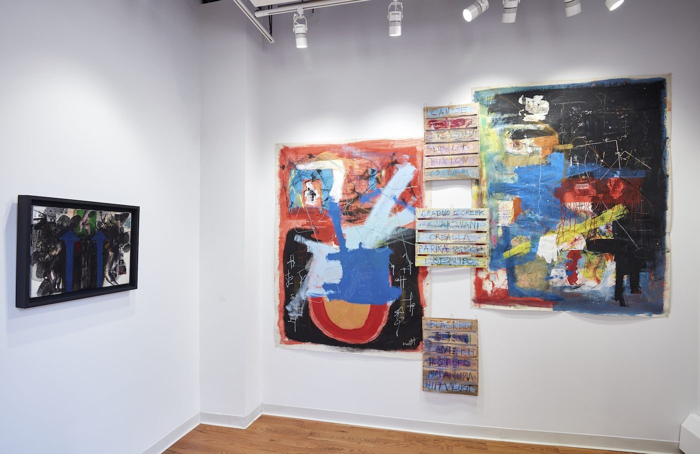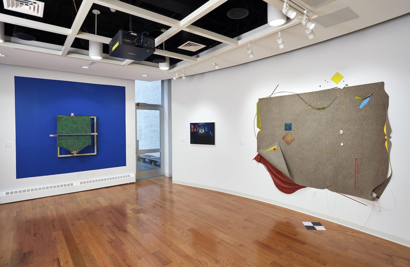 Installation view, G741 Drawing Structures, 2016, by Andrew Lyght (left), Untitled (blue), 2014, by Karran Sahadeo, (center) and Demerara Song, 2017, by Carl Hazlewood (right) at Caribbean Cultural Center African Diaspora Institute in Harlem, New York. Photo: Argenis Apolinario.