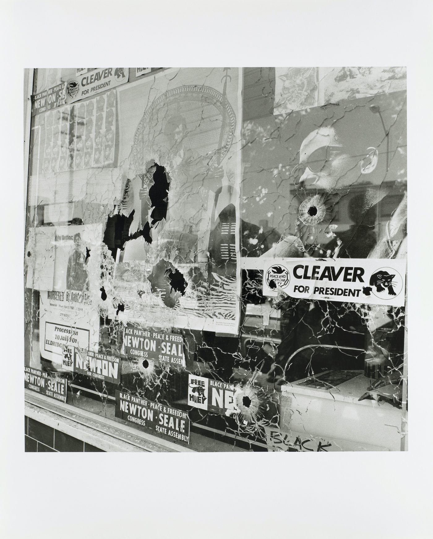 <figcaption> Pirkle Jones, Mirrored glass window of the National Headquarters of the Black Panther Party when it was destroyed by two bullets of Oakland police officers in the morning, 10.09.1968, from: Black Panther, 1968–1969 2010 deduction. Donated to the Pirkle Jones Foundation © Regents of the University of California Reproduction: Rheinisches Bildarchiv Köln
