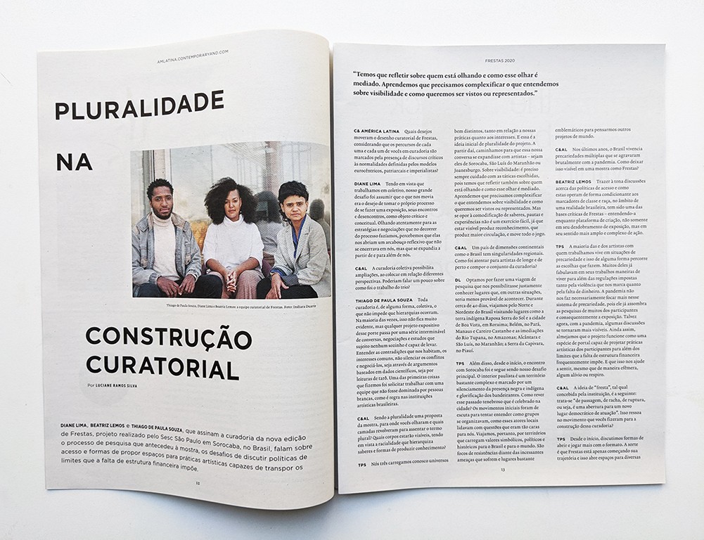 Esta tercera edición impresa de C&AL presenta a dos artistas que participan en la Bienal de Arte Contemporáneo Berlín este año, uno de los primeros grandes eventos del circuito de las artes en reunir público de nuevo: Aline Baiana y Naomi Rincón Gallardo hablan sobre sus prácticas artísticas y sus contribuciones para la Bienal. Luciane Ramos Silva, mediadora cultural y miembro del equipo de la revista brasileña O Menelick 2º Ato, conversó con el equipo curatorial de la Trienal de Artes Frestas sobre el proceso de organizar un evento de este porte en tiempo tan desafiantes. Y Leticia Contreras habla sobre sus reflexiones en torno a crear y desmantelar la idea de “hogar” y sus diversos modos de pertenencia.