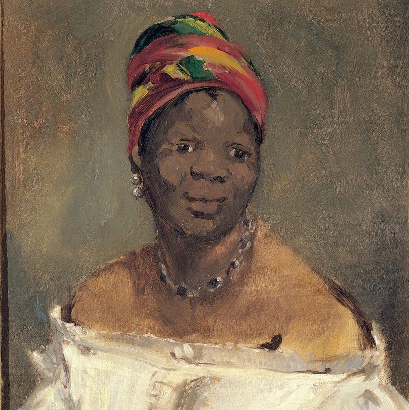Édouard Manet, Portrait of Laure (Detail), 1863. Pinacoteca Giovanni e Marella Agnelli, Turino. « Le nom est la première chose que les esclaves se font voler.[4] » (Aimé Césaire) Cette confusion nous ferait presque oublier une des démarches à la portée symbolique forte orchestrée par les organisateurs de l’exposition, à savoir « retrouver l’identité des modèles d’atelier longtemps restés anonymes, et […] mettre en évidence leur histoire et leur parcours[5] ». Dans ce sens, les commissaires se sont évertués à identifier les modèles et, bien que tous n’aient pas pu être nommés, le fait de renommer les œuvres tout en conservant les anciens titres doit être salué. Ce parti pris visant à une réhabilitation – d’aucuns diraient une « réparation » – est clairement énoncé par Anne Higonnet dans les pages du catalogue de l’exposition : « Dans la mesure du possible [dit-elle], changeons un titre anonyme en un nom. Plus de La Négresse de Manet, mais Portrait de Laure. Orientons nos recherches vers la découverte de ces noms, et si nous ne trouvons pas, expliquons pourquoi ? Donnons un nom à notre ignorance. Nommons les conséquences de l’histoire[6]. » C’est dans cette logique que les termes noir et nègre ou négresse ont été substitués soit par les prénoms retrouvés, soit par d’autres termes qui n’essentialisent pas les individus représentés. Ainsi, la célèbre huile sur toile de Marie-Guillemine Benoist alors titrée Portrait d’une négresse et datée de 1800, s’est muée en Portrait de Madeleine. Bien que, souvent, seuls les prénoms aient pu être retrouvés, force est de constater que cette démarche humanise le modèle, là où son anonymat le réduisait à sa seule fonction. D’aucuns souligneront qu’un prénom n’a pas valeur de nom. Mais cette absence de nom à une signification historiquement forte et le fait que l’on n'ait pas pu retrouver les noms de ces modèles ne fait que renforcer la portée de cette histoire.