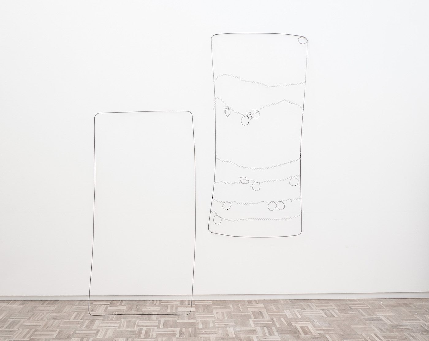 Bronwyn Katz, My naam is n plek,’n huis, grond (2017) | Salvaged wire; (left) 183 x 92 x 48 cm, (right) 183 x 92 x 9cm; installation dimensions variable