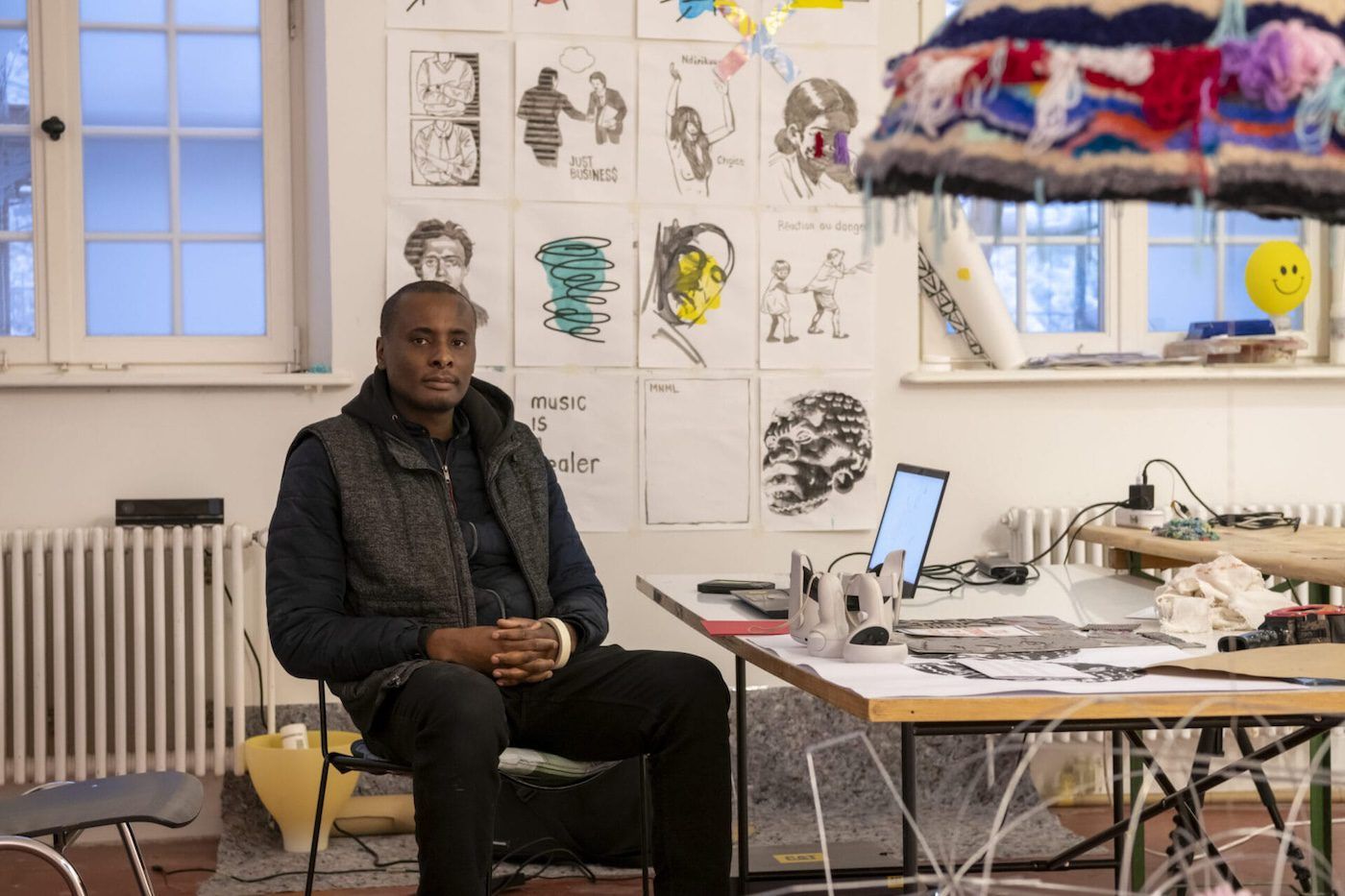 Kombo Chapfika in his open studio, Winterfest Akademie Schloss Solitude, 2023. Photo: Frank Kleinbach
