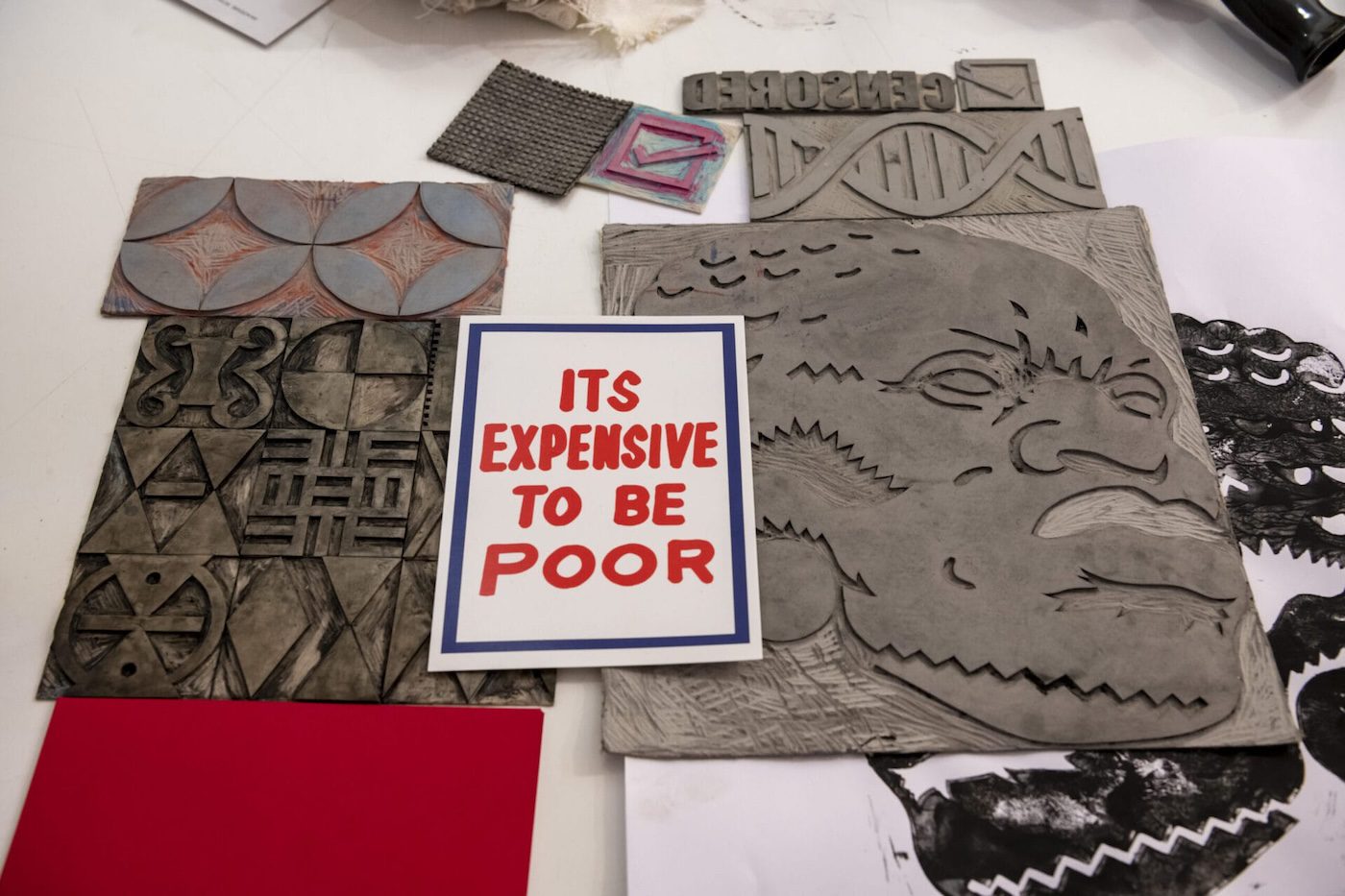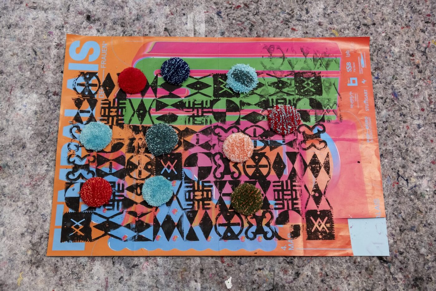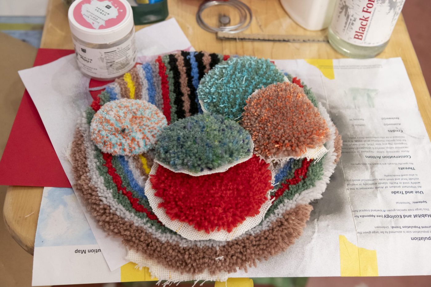 Kombo Chapfika, working with the technique of tufting, various works and materials, Winterfest Akademie Schloss Solitude, 2023. Photo: Frank Kleinbach