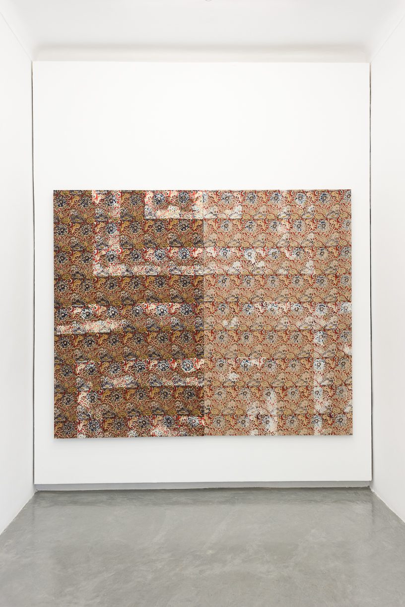 </a> Lina Ben Rejeb, Peintures domestiques No. II (Diptych) , 2019. Indian fabric, DMC embroidery thread, 204h x 123w x 4d cm, Unique. Courtesy the artist.</figure>