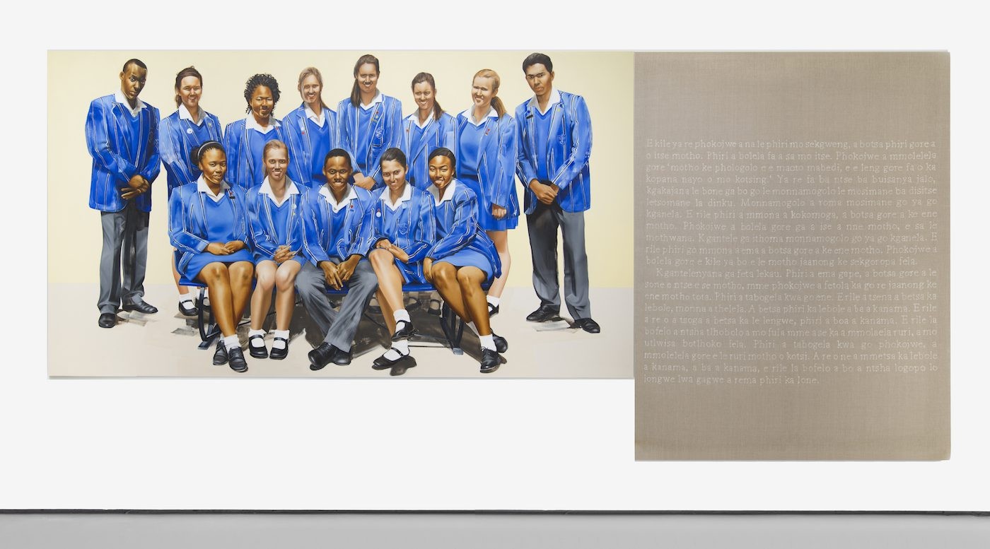 Meleko Mokgosi: My approach to examining history, which primarily involves a critique of historiography through history painting, centers on southern Africa as a case study. I am reluctant to say that I focus on Black subjects because this presumes a number of things that I am ambivalent about. Admitting to this would first and foremost propose that the paintings reflect a preoccupation with the notion of race, and the binary of White versus Black within this discursive framework. Although, as an African, I am aware of the histories and politics of race and how these are implicated in the colonial legacies of the region, my first priority is to articulate questions I am invested in, and simultaneously represent and voice experiences and histories that have been excluded from dominant narratives.