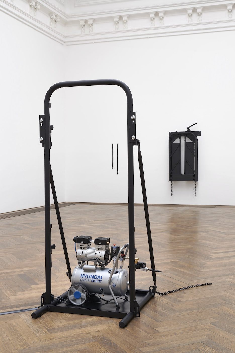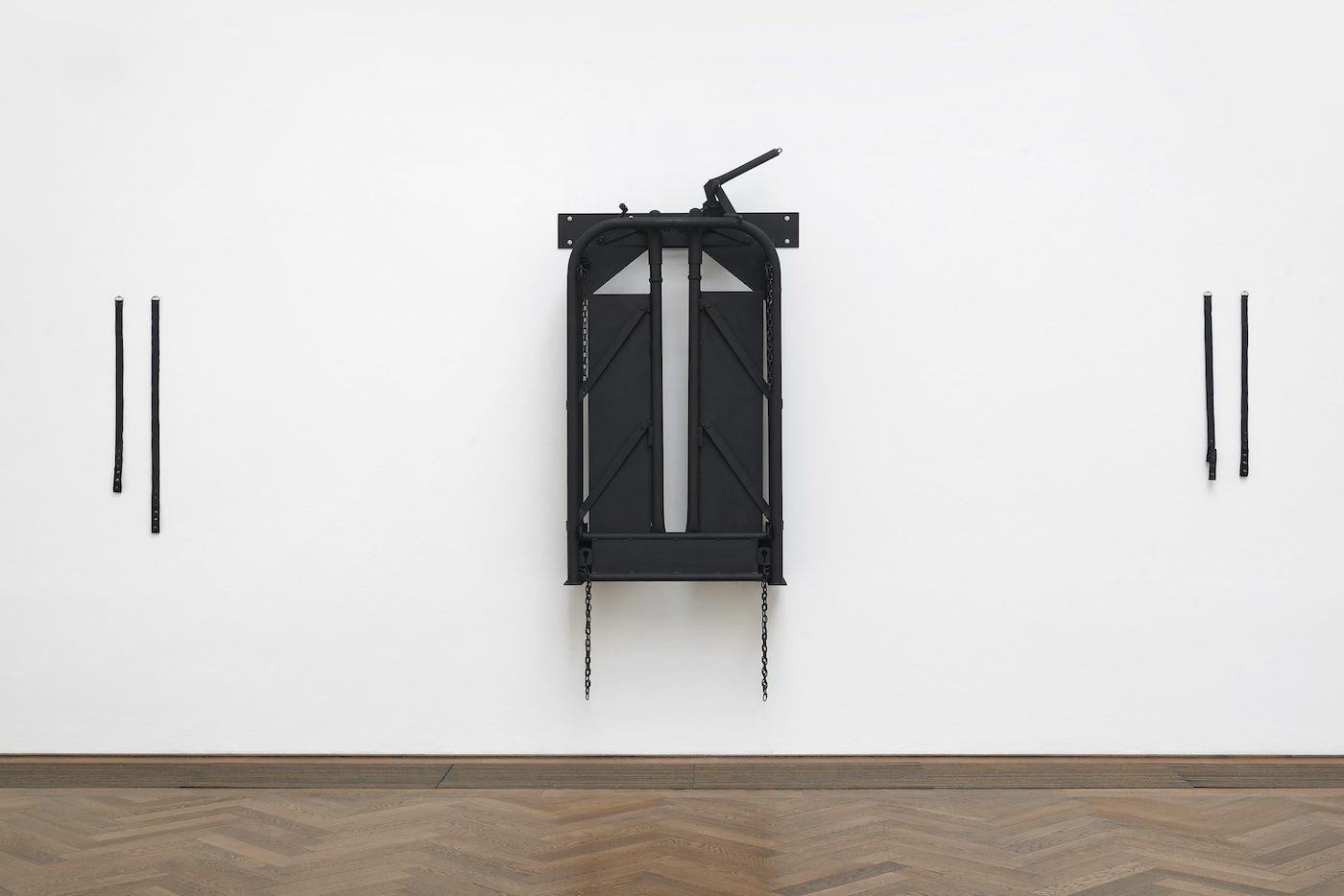 Voici les premières lignes du texte de Tionna Nekkia McClodden pour son exposition à la Kunsthalle Basel, intitulée « The poetics of beauty will inevitably resort to the most base pleadings and other wiles in order to secure its release » [La poétique de la beauté aura inévitablement recours aux plus viles plaidoiries et autres ruses pour assurer sa libération]. Ce titre et la première salle de l’exposition, peuplée d’œuvres aux allures de machines d’exercice tortueuses, évoquaient l’effort physique. Au centre de l’exposition se trouvait une machine à compression d’air qui, au bout de longs intervalles de silence, libérait un souffle long et laborieux. Malgré l’absence de corps, ces installations véhiculent une sensation corporelle. Chacune d’entre elles implique un mouvement ou son étouffement. Les cadres et les chaînes en acier (enduites de peinture et de cirage noir mat) de la série A MERCY convoquent la rigidité et le poids. Les ceintures de cuir pendantes de la série THRASHER ne demandaient qu’à être tendues.