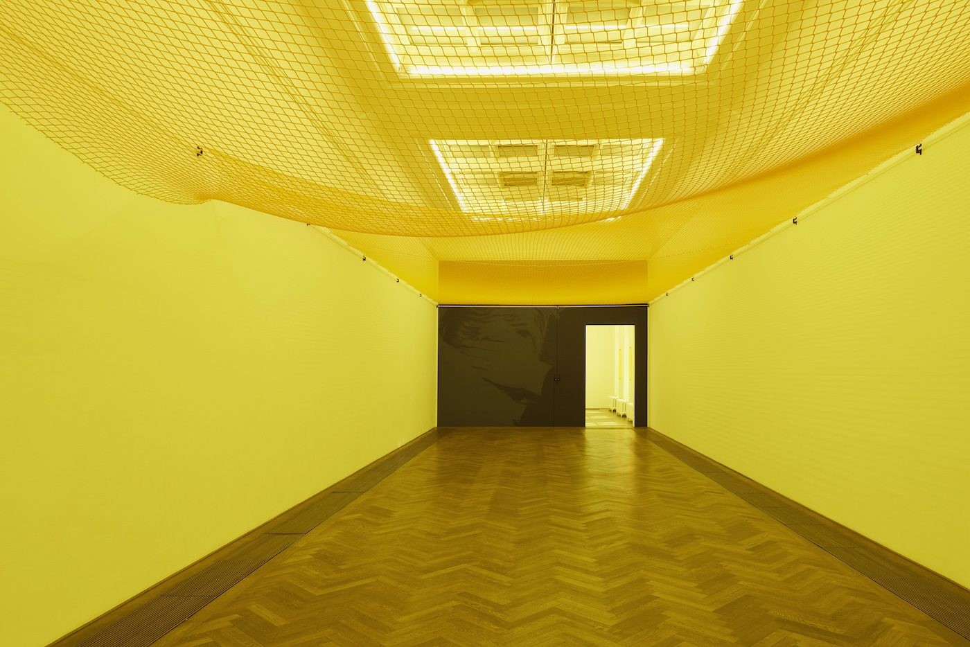 Dans la dernière salle de l’exposition, la plus grande, se trouve une installation vidéo intitulée La Nuit Américaine. Le titre est tiré de la technique qui consiste à donner à une scène de film analogique tournée de jour l’apparence de la nuit à l’aide d’objectifs et de filtres particuliers. L’œuvre vidéo montre l’inopérance de cette façade : le soleil surgit comme un orbe bleu flottant dans les coins des scènes, les ombres sont trop prononcées, les gestes des personnes sont clairement diurnes. Les mouvements de caméra sont vertigineux, tout a une teinte bleue, les lumières clignotent sur les murs de la pièce. L’installation vidéo évoque une attaque de panique en continu. Les images se superposent aux spectres de celles déjà passées, mais gravées dans nos rétines. Elle s’achève par un crescendo de lumière aveuglante. Dans La Nuit Américaine, la technique simule l’expérience de la dissociation.