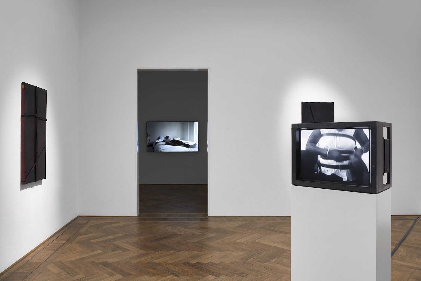 Les salles suivantes, plus petites et plus intimes, nous mettent face au corps de l’artiste. La première vidéo, intitulée DIRE / RETENUE, est diffusée via un écran à tube cathodique, évoquant une vidéo de surveillance. McClodden se tient dans une pièce, la caméra centrée sur son torse, qui se gonfle et se dégonfle à chaque respiration profonde. Elle se lie le corps avec des lanières de cuir à boucle, faisant écho à l’installation précédente. L’action fait penser à une routine médicale utilisée pour maintenir son corps en place. Lorsqu’elle se défait de ses liens, sa respiration lourde semble être le symptôme de sa tentative désespérée de se défaire de ses liens. Tout autour de l’écran de télévision se trouvent des toiles peintes avec des touches de cirage et attachées avec de la corde de jute nouée à la manière d’un shibari. Le ligotage est un acte aux multiples fonctions : pour changer la forme de son corps, en tant que pratique médicale, pour jouer avec les dynamiques de pouvoir associées à la sexualité hétéronormative et les subvertir.