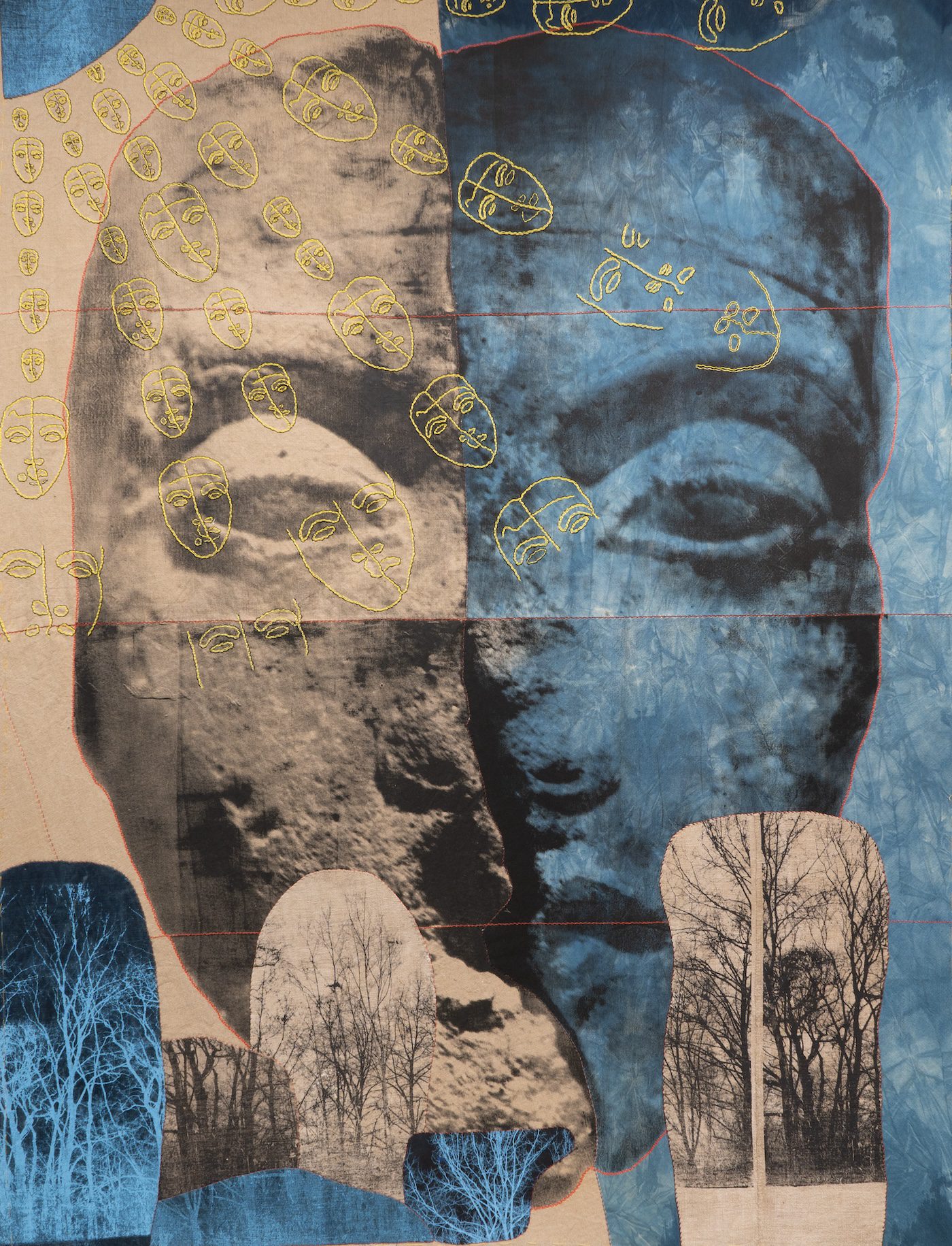 Zohra Opoku, ‘My head shall not be taken from me…’ [Extract from Chapter 43: Spell for ‘Not letting the head’ / An Ancient Egyptian Book of the Dead/ The Papyrus of Sobekmose], 2024. Screenprint on linen, screenprint applications, hand embroidery, hand stitched. Courtesy of the artist and Mariane Ibrahim (Chicago, Paris, Mexico City)