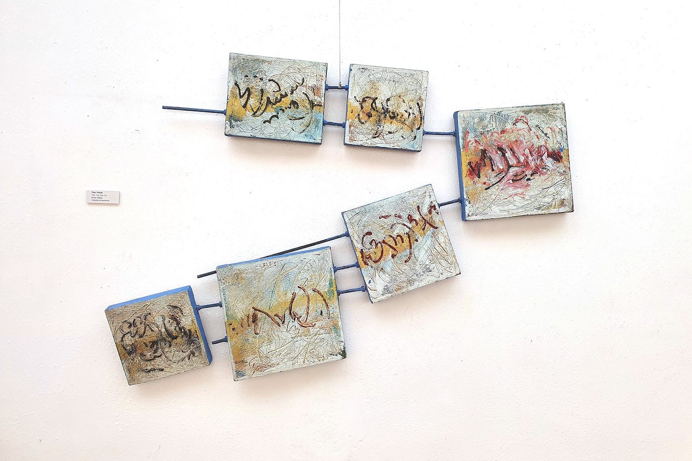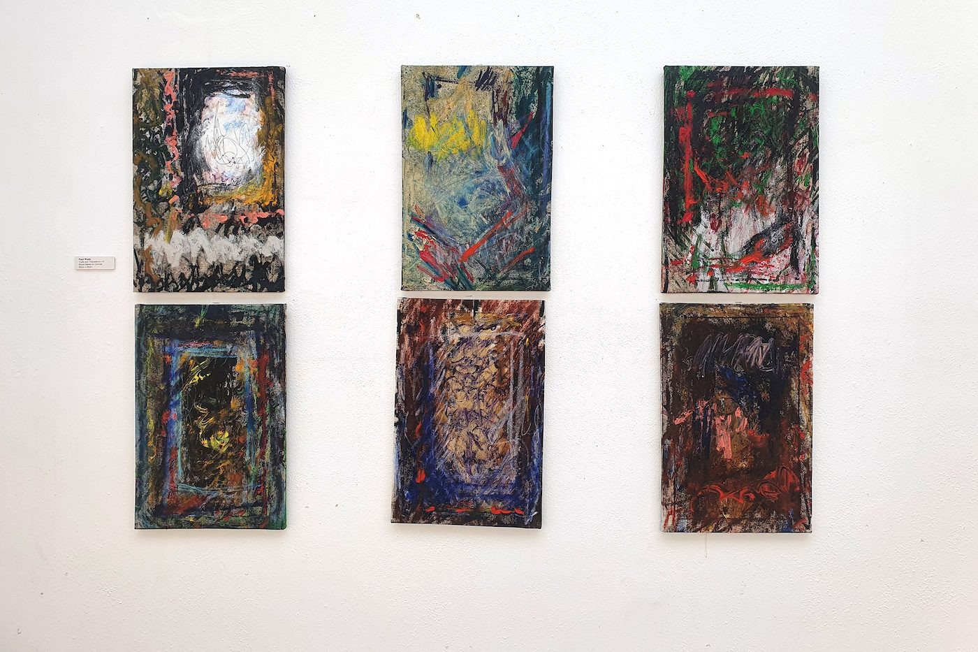 For someone working in a non-representational style, Wade’s titles also paint vivid pictures. Lines such as Fallen Crucifix, Sign on the Dotted Line, and Highways and Byways project a clear mental image on the viewer’s mind. Black on Black and Essence of Black cannot be entirely seen as descriptions of color. Through predominantly thick layers of paint in various shades of black, luminescent marks in blue, green, orange, yellow, pink, and other pastels peek between cracks in the brushstrokes, betraying a layered background much like the artist’s mixed heritage. Wade says the pieces were about eliminating color, and created at a time when he was not feeling well. Eventually it was a relief to bring back color in his work, he says in a digital conversation with David Chinyama, and this coincided with his improved wellbeing. Two other paintings in the exhibition have a technically similar yet opposite look. A Little Itch and A Bigger Itch are predominantly white without making whiteness the subject.