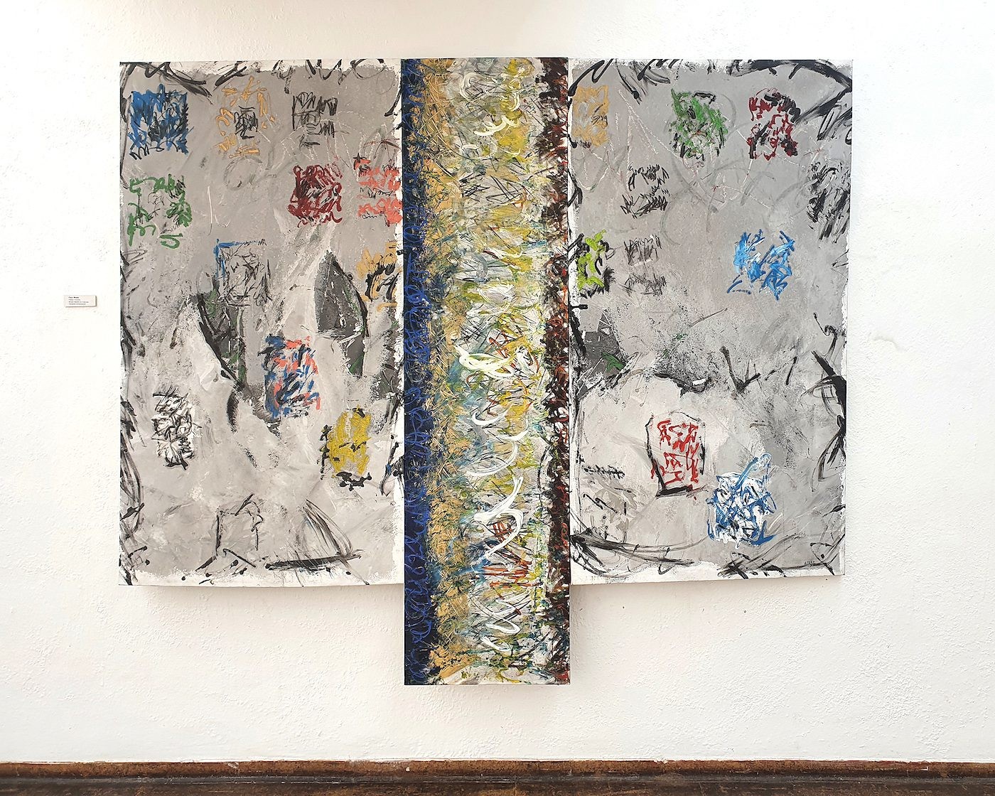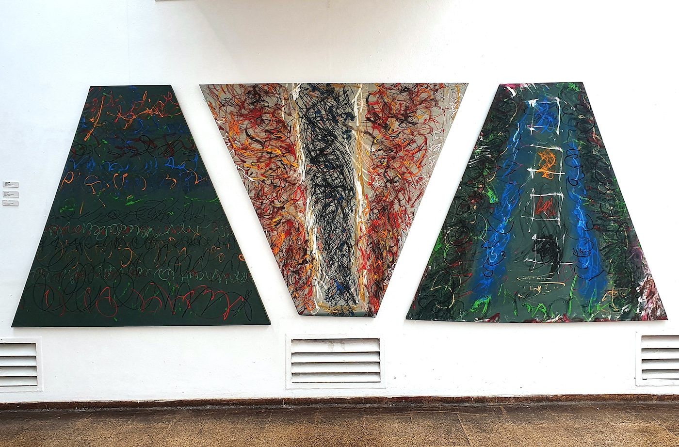 A triptych titled Avenues has grid lines that indicate unique blocks in contrasting colors. In Harare “avenues” does not just describe tree-lined streets. It also refers to an area just outside the city center, where Wade lived at one time. The Avenues is associated with nightlife, and the sex workers who try to seduce the revelers there. Wade’s artworks celebrate the area with profusion of colors that might relate to its blooms and foliage, girded into blocks overlaid with spontaneous scrawls. In his style some may see traces of Willem de Kooning, Mark Rothko, or Cy Twombly, but his personal experiences together with local landscapes, social, economic, and political issues resonate through the work.