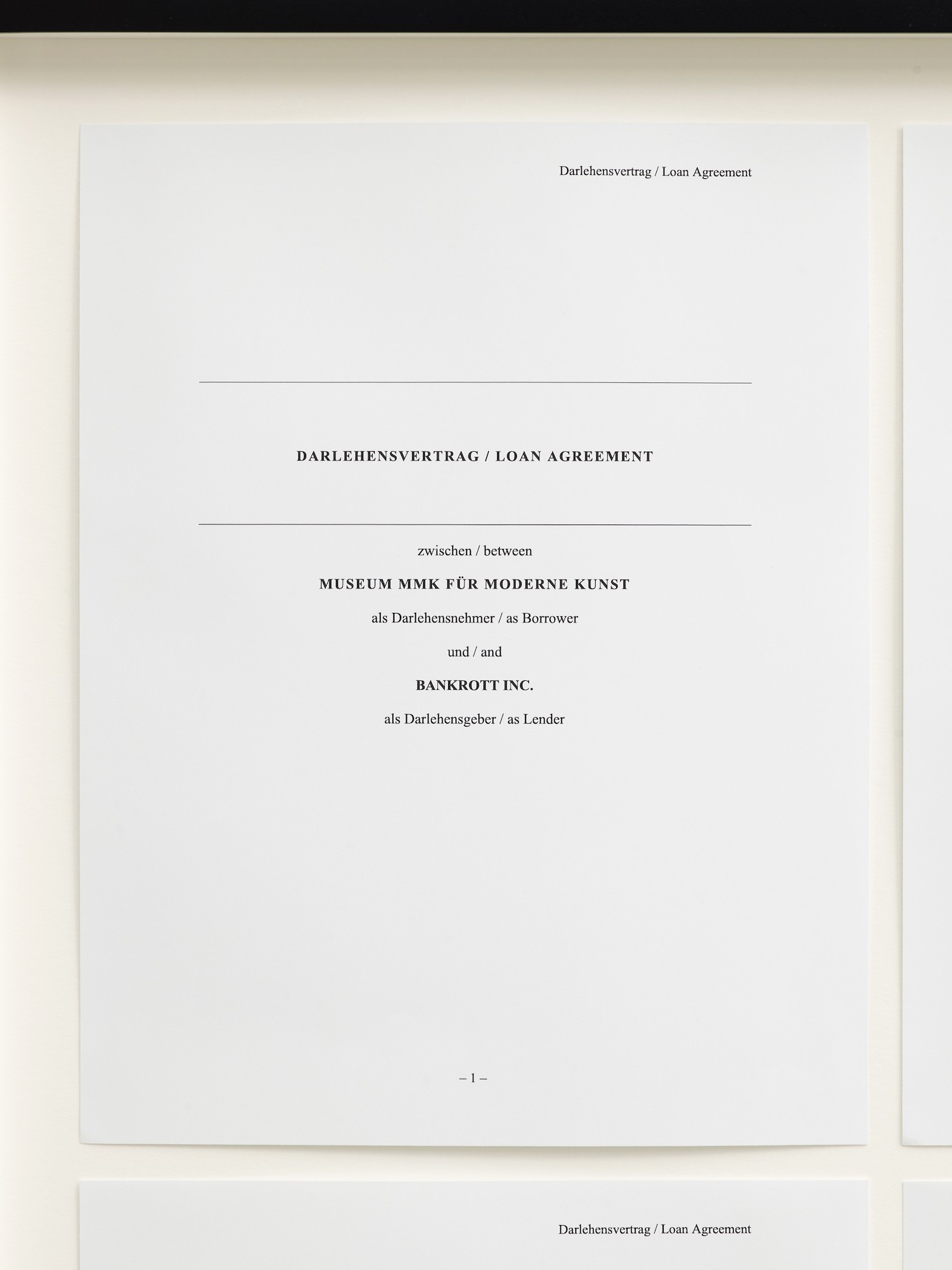 In twenty-five years, the Museum für Moderne Kunst (MMK) in Frankfurt will owe Cameron Rowland 1,256,518.73 Euros. This is the amount that the sum of €20,000, which Rowland lent to the museum as part of his exhibition Amt 45 i, on view at TowerMMK , will generate at an annual interest rate of 18 percent. More specifically, the museum will owe this money to the corporation Bankrott Inc., which Rowland founded and also directs. The legally binding loan agreement, which is an element in the artwork Bankrott (Bankruptcy, 2023), and can be viewed, page by page, in the exhibition. Although the life of the loan is indefinite, the table included as an annex to the contract gives an overview of how the debt will develop up to the year 2122. By that year the MMK will owe the corporation €311,591,692,053.27 – an astronomical sum that would currently exceed the economic output of the entire metropolitan region of FrankfurtRhineMain.