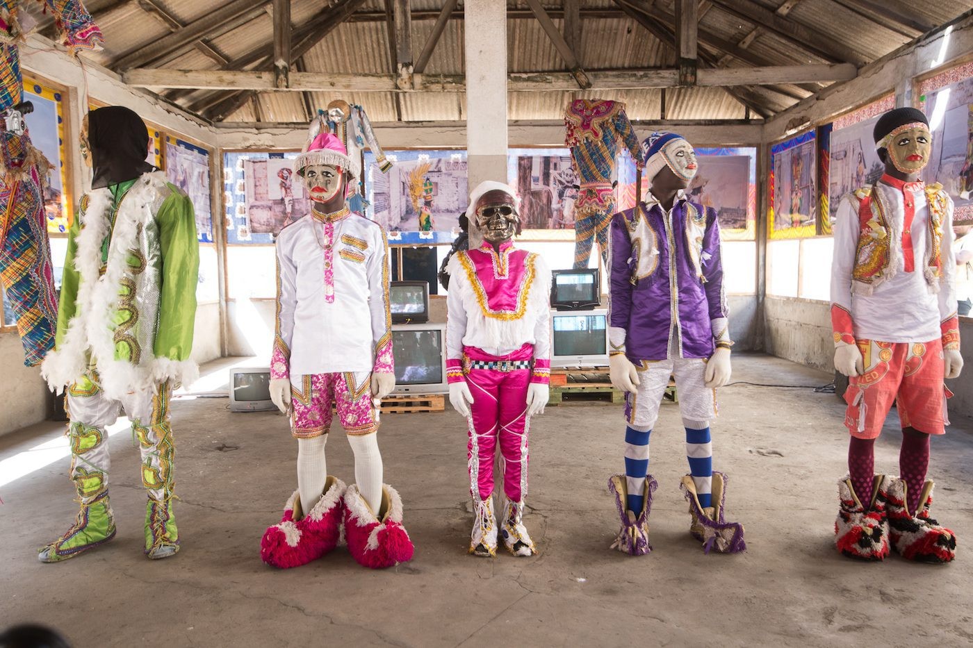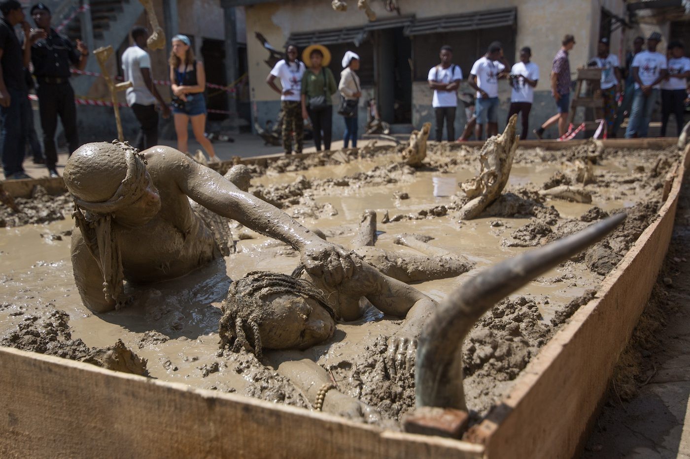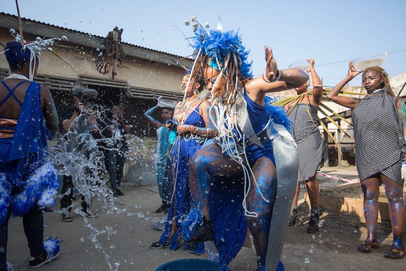 Naturally CHALE WOTE did not escape its share of drama and trials. Among its list of hurdles, a procession in honor of the goddess Mami Wata drew harsh criticism from religious fundamentalists within Accra. The procession was much more a political call to action among people of African descent than an ode to the deity; her name was repurposed to use its “Wata” force as a political mobilization apparatus. Yet fundamentalists could not embrace the activity as a radical political demonstration cloaked in traditional performance and ritual, and were quick to call the festival evil. In another incident, Accra’s Gallery 1957 was called out for plagiarizing Josephine Kuuire and Aryeequaye’s CHALE WOTE exhibition, The Country Formerly Known as Ghana, which utilized the costumes and performance practices of the Winneba Masquerade. And lastly, several people, both local and foreign, were caught attempting to record footage without proper accreditation. Despite some negativity, the streets still filled up with troupes of couples, children of all ages, young people posing for selfies or videos, and even high-ranking officials who just had to join in the jamboree.