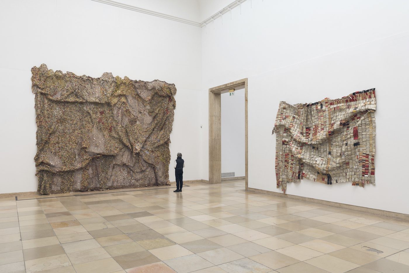 El Anatsui, Dusasa II und Man’s Cloth, 2019 (from left to right). Installation view Haus der Kunst. Photo: Maximilian Geuter
