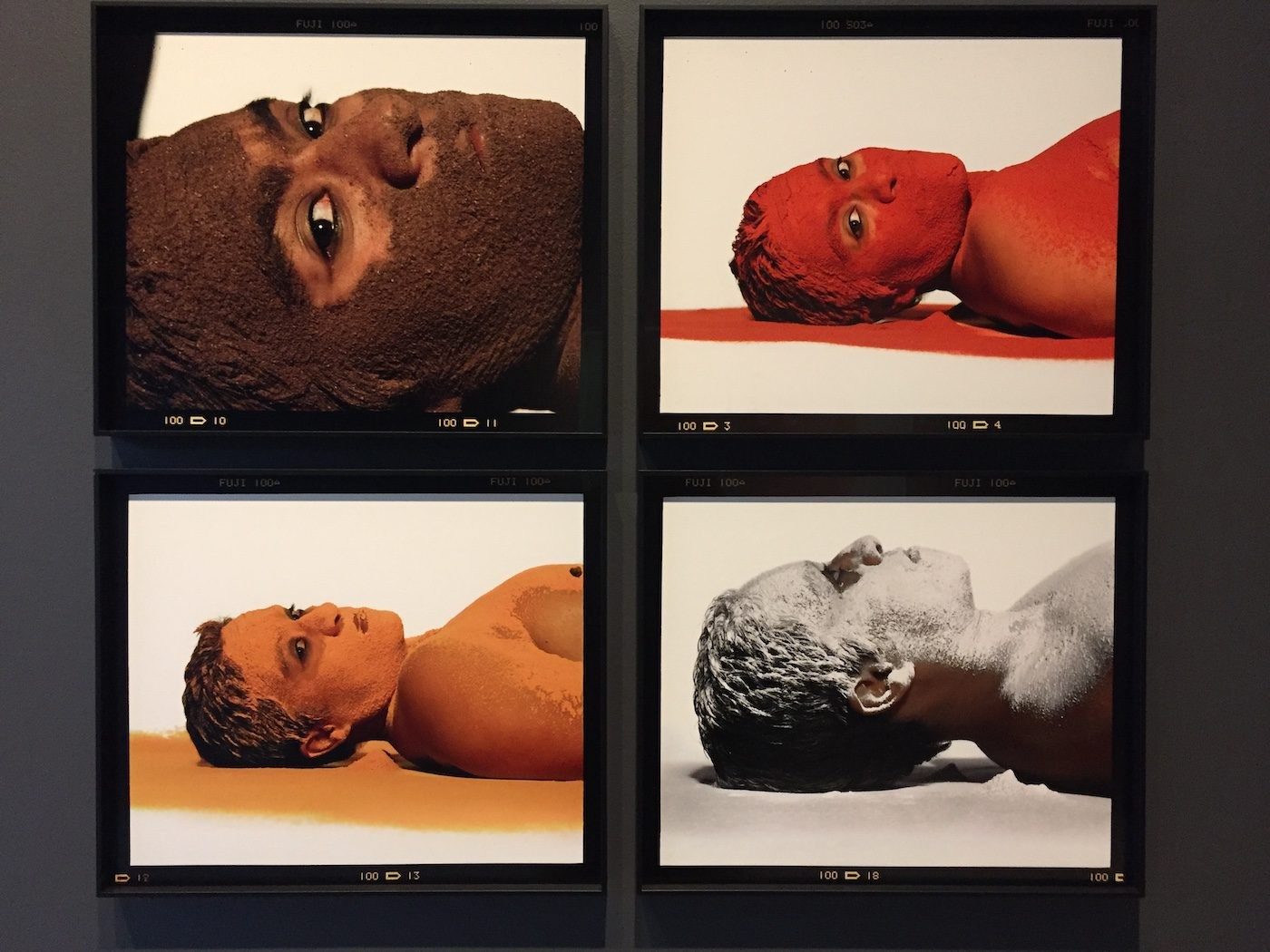 Throughout the show, the body, or more precisely, the artist’s body, is marked by highly pronounced meanings and is constituted as what Desiree Lewis, professor of women and gender studies, called, in a text on Searle for Agendajournal in 2001, “objects of the gaze.” Or, quoting film theorist Laura Mulvey, Searle’s approach could be read as a “to-be-looked-at-ness.” In Untitled (red, white, yellow, brown) (1998), from the Colour Me series, a still and supine Searle stares dead silent at the perceiving subject; this muteness reverberates throughout the retrospective, reminding me of Lewis’s caution that Searle’s figures are caught in a web of violent meanings that are “extremely difficult to dislodge,” that signals a “legacy of scrutiny.” Searle’s looking weighs on you; it may be what philosopher Lewis Gordon calls a “form of illicit seeing” that reaches at you, beckoning you to bear witness. However, both Lewis and the late artist Mgcineni “Pro” Sobopha have argued for some transformative potential in Searle’s work, Sobopha asserting in Agenda in 2005 that Searle “demystifies and fractures our understanding not only of colour, but she also creates new meanings.”