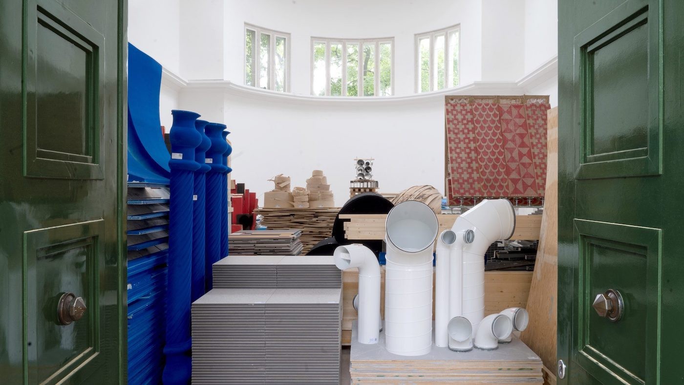 The German Pavilion as a material repository. Open for Maintenance. curated by ARCH + | @archplusnet, SUMMACUMFEMMER, Büro Juliane Greb; Curatorial team: Anne Femmer, Franziska Gödicke, Juliane Greb, Christian Hiller, Peter Krag, Melissa Makele, Anh-Linh Ngo, Florian Summa, commissioned by the Federal Ministry for Housing, Urban Development and Building. Photo: Courtesy of Bureau N.