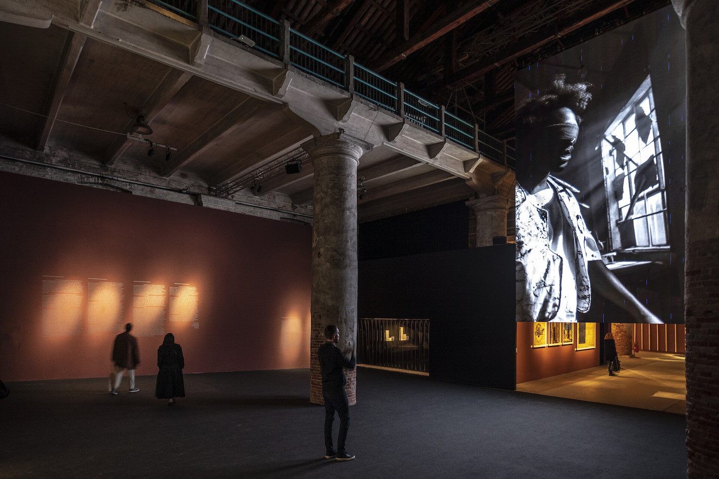 Poet and architect Rhael “LionHeart” Cape appears on a large screen that merges images and words in Those With Walls for Windows (2023), flashing through calls for action on current housing, displacement and migration crises among quotes from Audre Lorde and James Baldwin. The film is placed just before the contribution from Nine Studio and Sammy Baloji, titled Aequare: the Future that Never Was. The quotes, the poems and the films intertwine the path for visitors to start looking for connections beyond the standard parcour of the exhibition display in the former artillery reservoir of Venice.