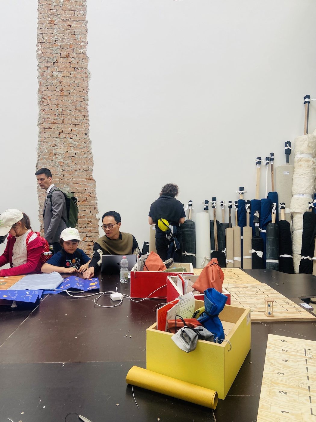 At the workshop, left wing of the exhibition project Open for Maintenance, with Anh-Linh Ngo, who curated this year’s German Pavilion, together with Krag and Juliane Greb (Büro Juliane Greb), Anne Femmer and Florian Summa (Leipzig-based practice Summacumfemmer), Franziska Gödicke, Christian Hiller, Melissa Makele and ARCH+. Photo: María Inés Plaza Lazo.