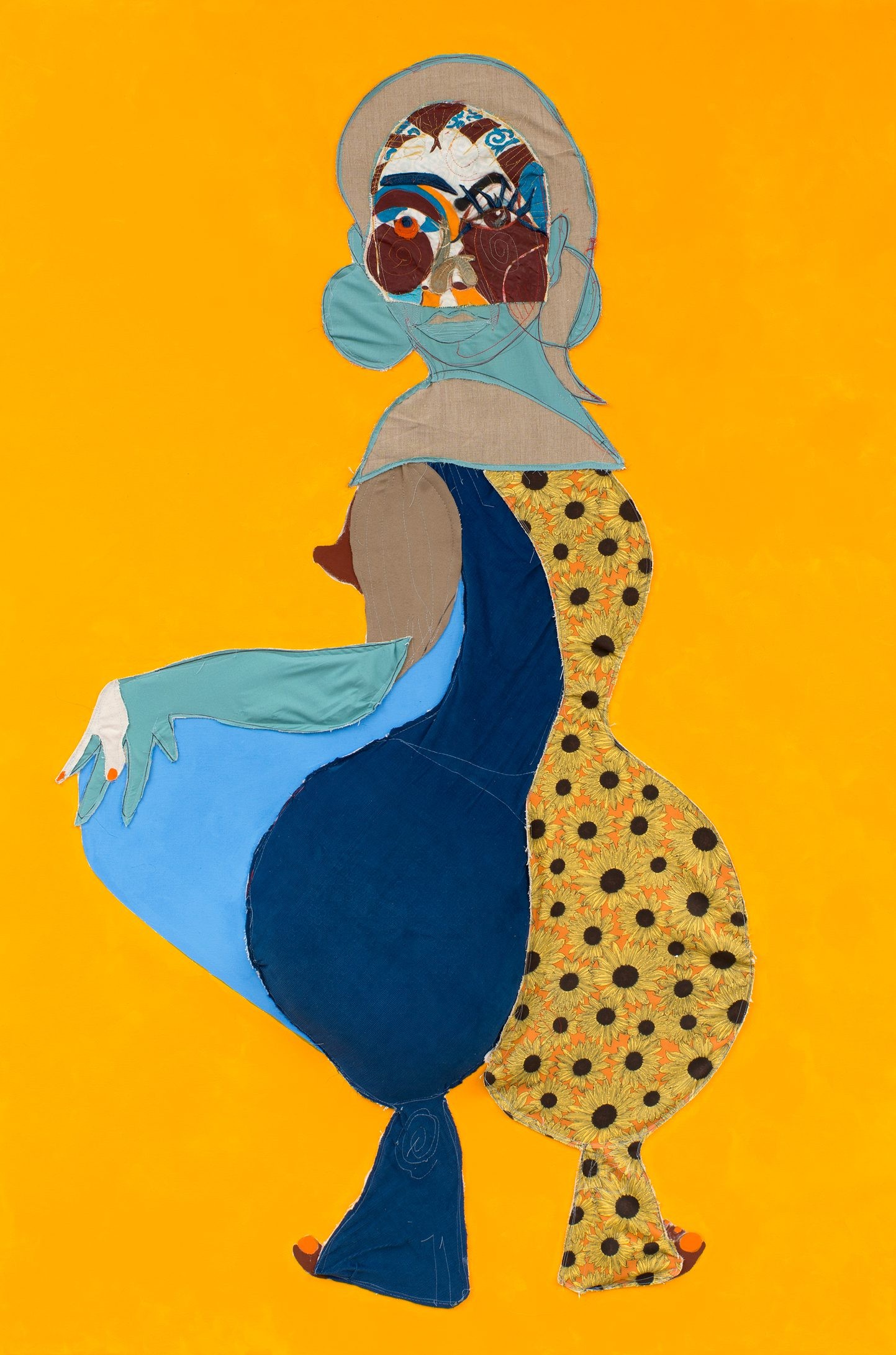 The uniqueness behind Self’s aesthetic comes from her tactic of dismantling the female form in order to put it back together. This reconstruction of the body through different patterns and fabrics introduces a level of abstractness, granting her characters a surreal dimension. In For the Gods, for example, the figure looks up toward the sky, performing a high kick that extends behind her head in a superhuman fashion. In Spare Moment, the vibrant colors and intentional compartmentalization of the body draw the viewer’s attention to the confidence lying in the figure’s steps as opposed to physical attributes of her shape. Self’s pantheon of characters with such strong personas invites audience members to think deeper about their personal narrative and state of mind.