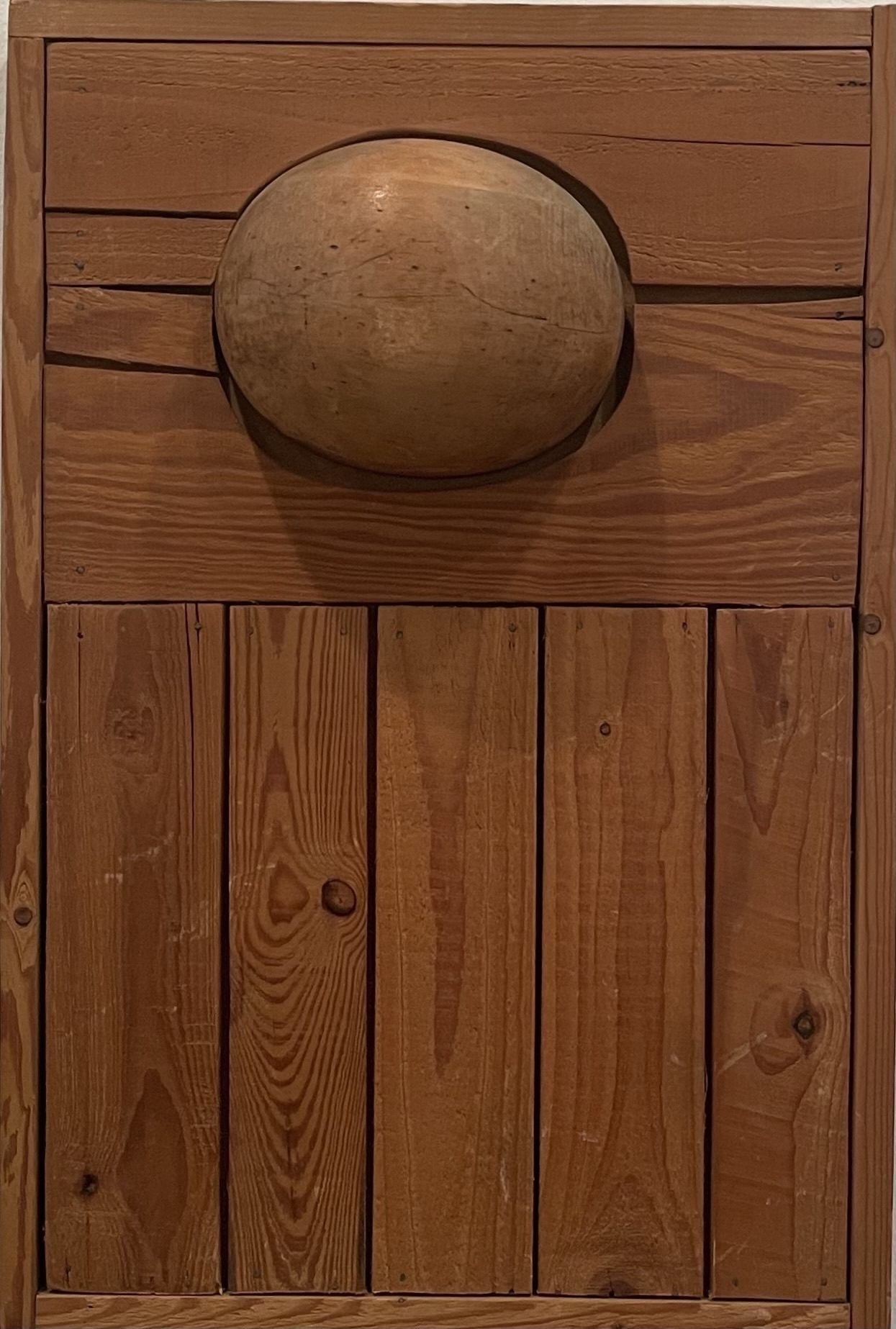 Thompson developed her distinct style in both two and three-dimensional forms. Using found and manipulated wood, the artist created “wood pictures,” blurring the lines between painting, sculpture, and collage. These works carefully articulate a balance between organic and manmade, as in Wood Picture (c. 1965). A masterful juxtaposition of natural elements and evidence of human intervention is seen in the disjunction between the rippling wood grain and the carefully ordered arrangement of the wood pieces. The smoothed and polished appearance of the protruding orb, shaped by the artist’s hand, contrasts with the rough surface of the surrounding planks.