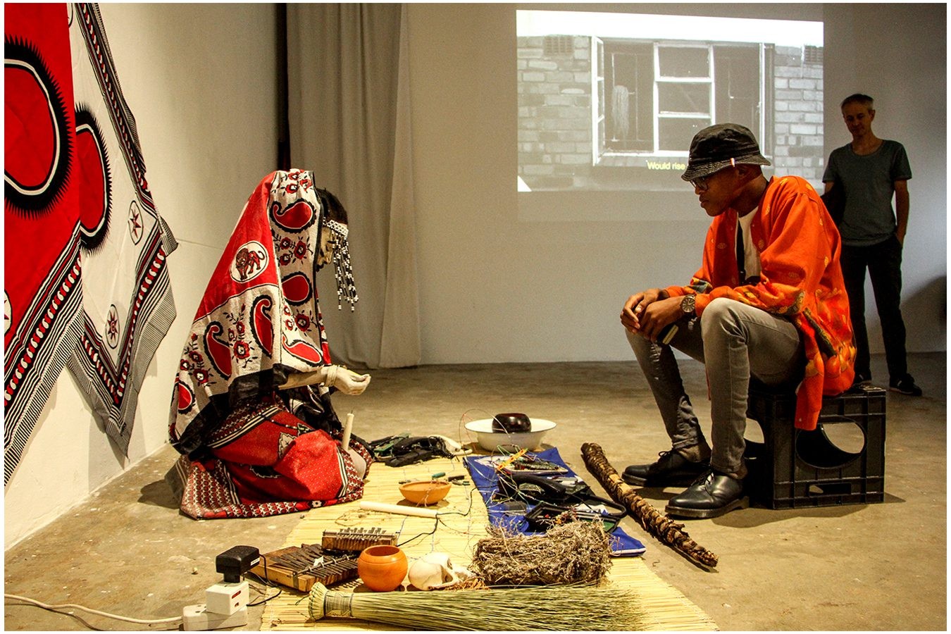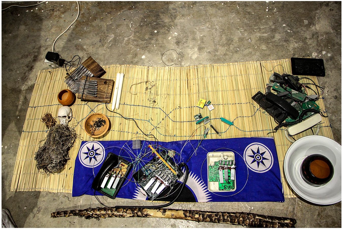 Joshua Chiundiza’s Bones and Dual Tones (2018) was a radically interactive sound and performance art installation proposing the potential of creating connections to African cultural practices through digital technology. It foraged for vibrations and voices that exist beyond the objective world, and so essentially explored subjective reality—a reality that is unique to each of us. Phone receivers connected within a circuitry became terminals for interaction with the imaginary, and voices on both sides of the receiver were unintelligible. Using recorded samples of Mbira, a traditional instrument from Zimbabwe, Chiundiza’s project reclaimed a spatial relationship with the spiritual realm, reinventing cultural practices through a material, electronic medium accessible to younger generations.