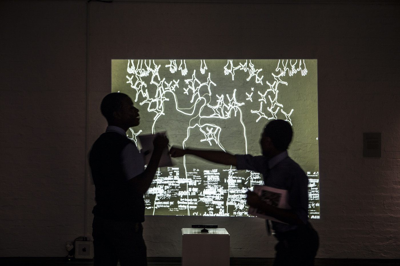 These models are tentative, entering into territories that have been dismissed as irrational, particularly when approached from a positivist perspective. They do not aim for the empirical, for the practical, but for a visceral connection to non-human consciousness. In Kombo Chapfika’s Borderlands (2018), the digital gained a proprioceptive quality by creating an awareness of the body that is enmeshed within a hallucinatory spectrum. By standing in front of kinetic sensors, the viewer could engage a shadowy, psychedelic form. This augmented reality installation, showcased at the Wits Art Museum, recreated the effect of taking Iboga, dried roots used among the Bwiti tribe to induce hallucinations during communal ceremonies. It was a metamorphosis, an awareness of a lightness of being, that this work achieved and which presented a salient model of what technology, and digital arts in particular, can achieve in the process of reconfiguring communal values.