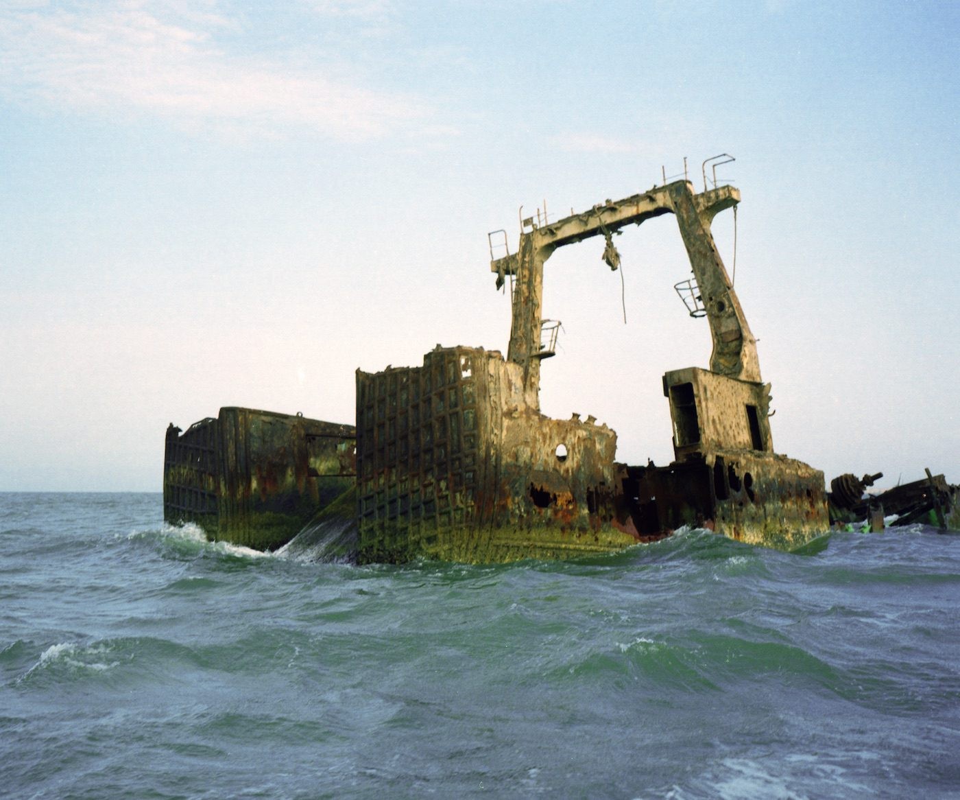 Zineb Sedira, Maritime Nonsense and Other Aquatic Tales, 2009. Triptych, C-prints mounted on aluminium, 100 x 120 cm each. Produced and commissioned by Iniva – Institute of International Visual Arts, Rivington Place, London. View of the installation, 2009. Photo: George Torode. Courtesy the artist and kamel mennour, Paris