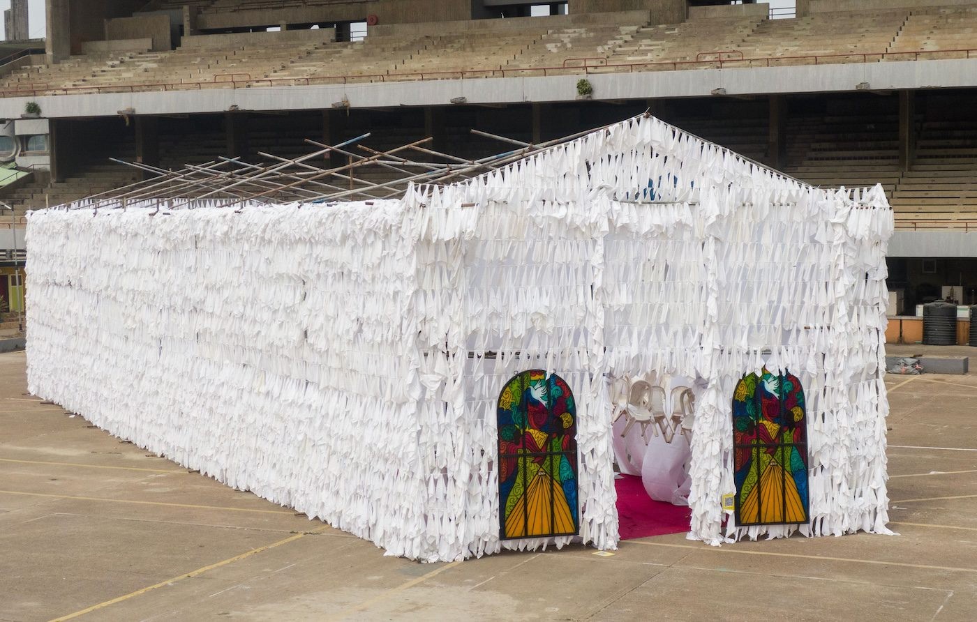 Victor Ehikhamenor's Miracle Central, a temporary churchlike structure erected at one end of the square, was a remarkable embodiment and critique of Nigerian Pentecostalism. Outside, the building was bedecked with white handkerchiefs; inside, the walls were draped in large strips of white cloth and white plastic chairs hung from strings attached to rods across the open roof. Above a pulpit hung snare and bass drums, a cymbal, a talking drum, bells, an electronic keyboard, guitars, microphones, and microphone stands. Pre-recorded sounds played from the speakers, filling the air with church songs, prayers, and scraps of sermons. Ehikhamenor highlighted, in this installation, the powerful place religion and Christianity hold in Nigerian life. People come to these centers to obtain miracles, healing, and protection, for which they give everything they have. Miracle Central was set up to lay bare the exploitation and manipulation inherent in Nigerian religiosity, but its message applied just as strongly to the corrupt politics of the Nigerian state.