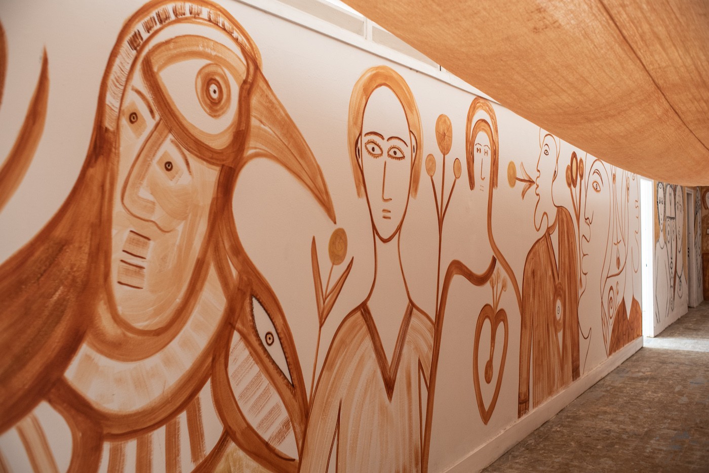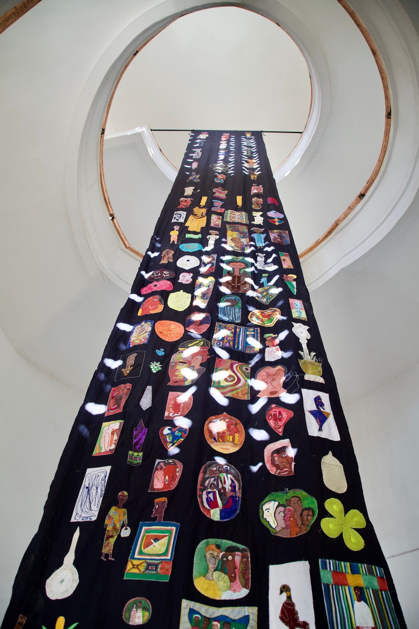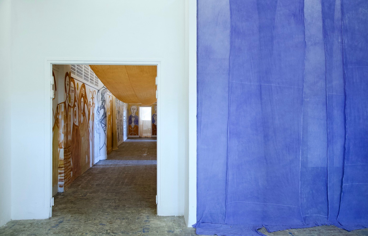 Alioune Diouf (*1964) was born and lives in Dakar. Since childhood, he devoted himself to carpentry and woodwork, later his interest shifted to sculpture, drawing, painting. In the nineties, he was one of the artists that occupied and revitalised the area of the famous art colony in Dakar Village des Arts, which is in operation until this day. For several decades, he worked with Senegalese artist Issa Samb (Joe Ouakam), with whom he continuously creates an extensive environment in Samb’s yard. After a two-month residency at Selebe Yoon, the artist presents a monumental exhibition specific to the site, a series of drawings made with natural pigments and his series “Gouney Jagaal” which intertwines sewing and painting.