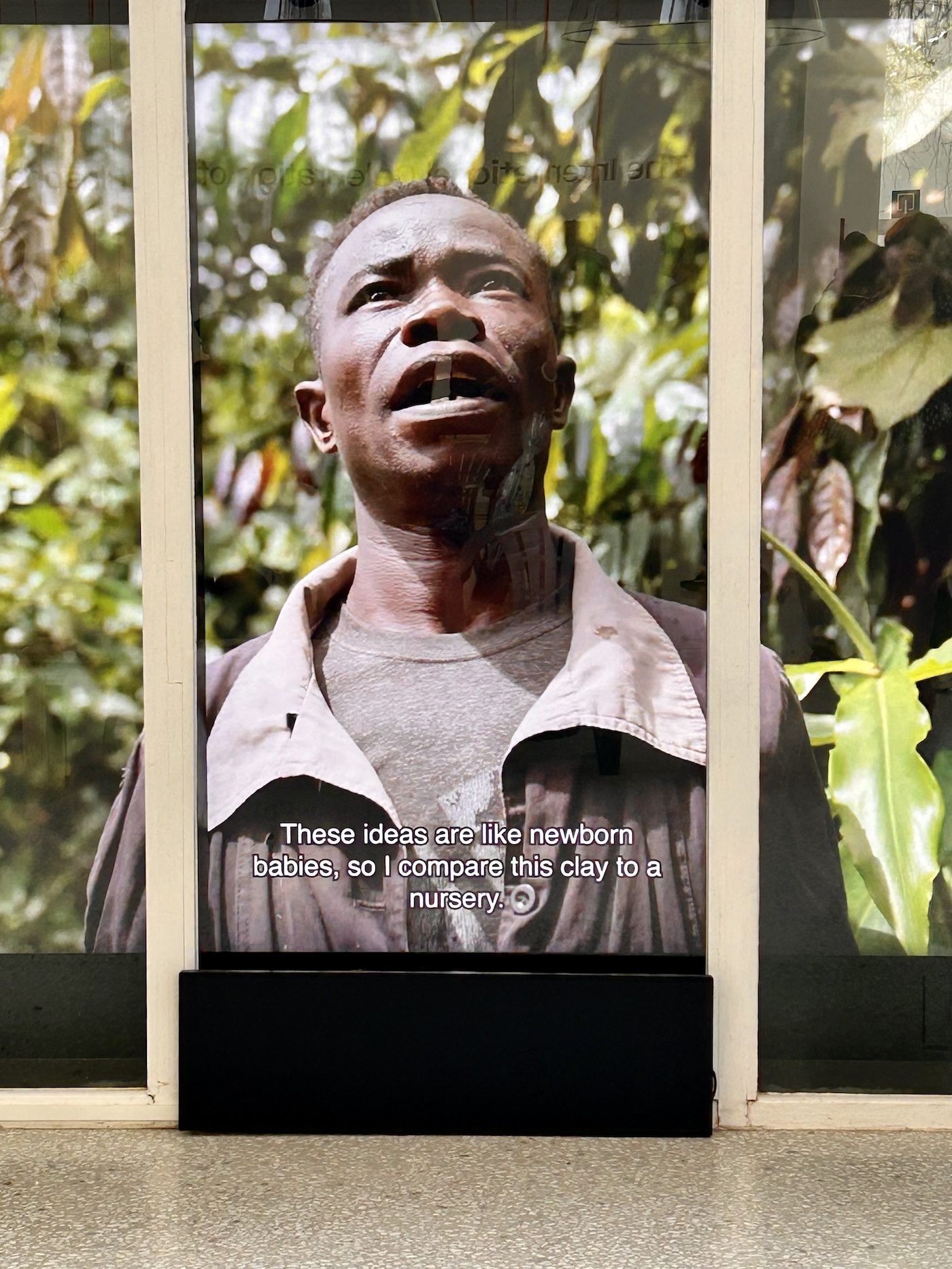 Which brings me to the Dutch Pavilion at the Giardini and The International Celebration of Blasphemy and the Sacred, by Congolese artist collective Cercle d’Art des Travailleurs de Plantation Congolaise (CATPC) and brought together by artist Renzo Martens and curator Hicham Khalidi. The exhibition is one of many layers of the efforts of CATPC to reclaim depleted plantation lands and restore the Sacred Forest plundered by European colonizers. In Lusanga, the collective make sculptures from clay sourced from old-growth forests; they are then recast in cacao and palm oil in Amsterdam, as a fruit of their own labor but also as iconic representations of extractivist subjugation that the plantations in Congo still represent. Displayed alongside plantation-set films starring the artists, the sculptures embody a transition from painful past to the call for an ecological future. CATPC acts as an uncomfortable formation whose existence challenges the ideologies of dominance that have constructed the white cube as a clinical, segregationist space.