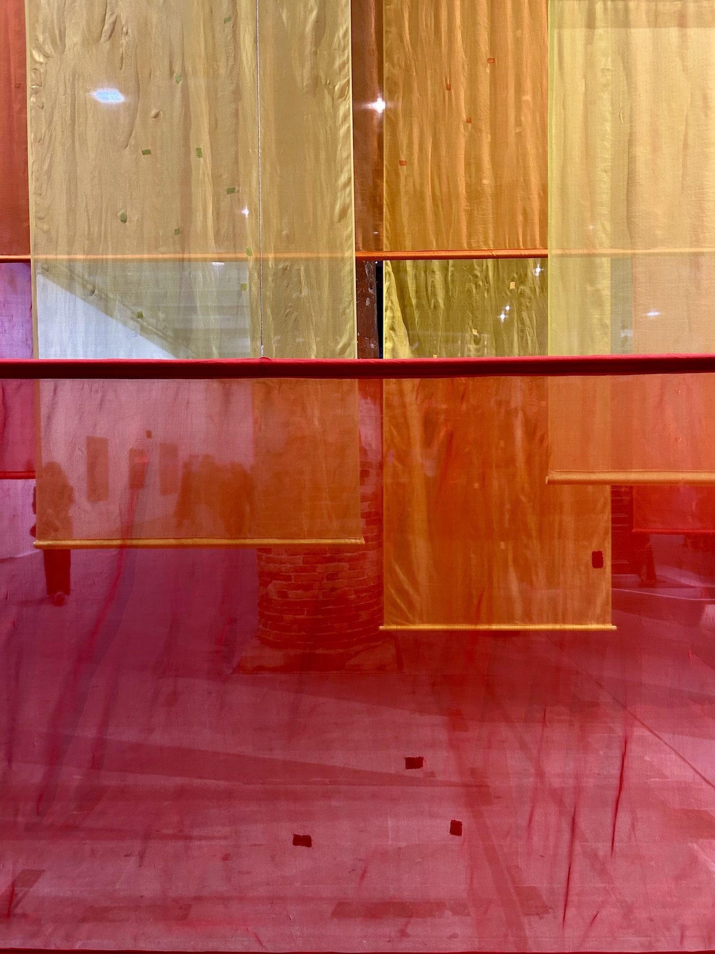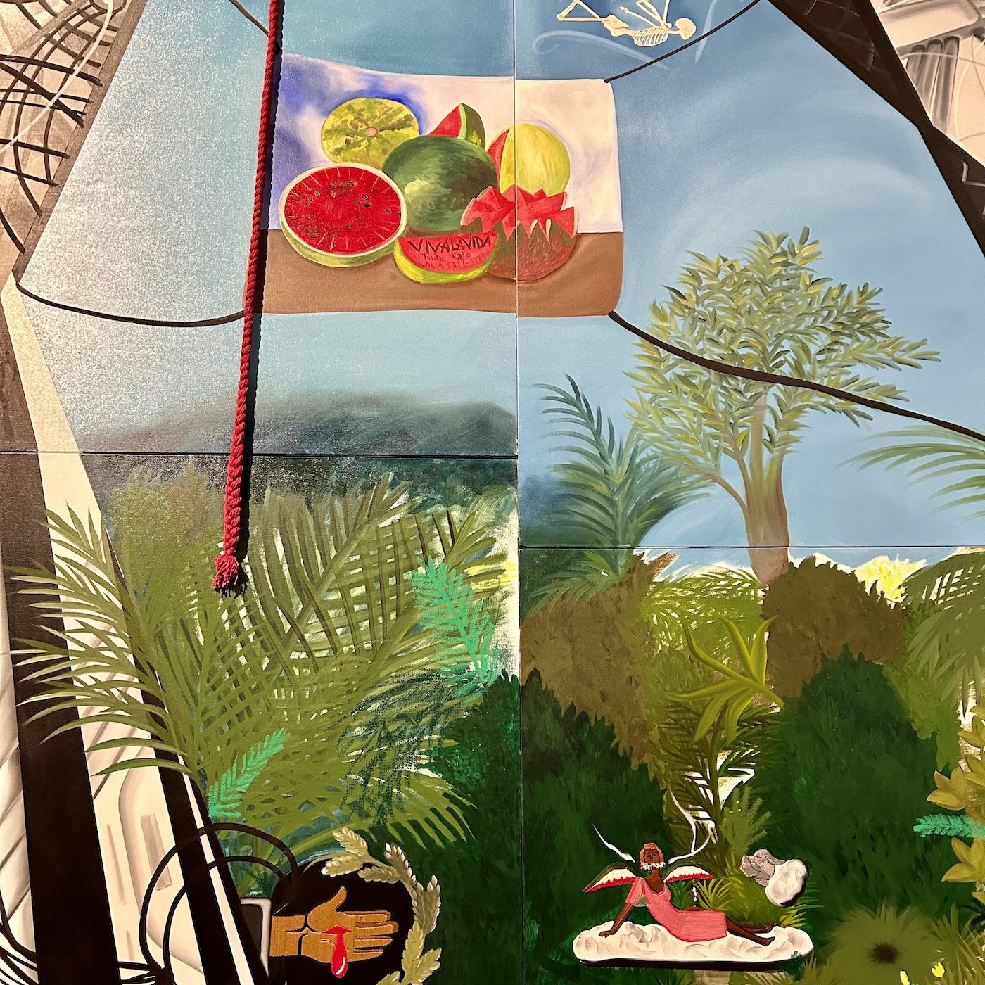 Palestine is everywhere in this biennale. One example is Frieda Toranzo Jaeger’s moving and disconcerting double-sided mural-sized oil painting Rage Is a Machine in Times of Senselessness – a layered composition in which machine-like structure elevates towards a lush landscape, emitting braids and plumes of red smoke, onto which Toranzo Jaeger has written “Viva Palestina Viva” several times. A banner shows cut watermelons, a symbol of Palestinian resistance but also an homage to Frida Kahlo’s final painting. Tableaus of nude women cavorting on a cloud are embroidered onto the canvas; on the back of the canvas the artist has scrawled Sappho’s verse “You burn me.” Another is Dana Awartani’s evocative installation of translucent silks medicinally dyed in warm colors and filled with patchworked stitches, soaked in kinship and the spirit of ancient communities. A requiem for heritage sites destroyed in the Arab region during wars and terror, the piece tenderly holds Palestine’s ongoing occupation and the devastation of Gaza through symbolic scars in the fabrics. Weaving, enmeshing, amalgamations, and non-linear narrations are the idiosyncratic fundamentals for an exhibition that prioritizes intimacy over conceptual coherence: every work infiltrates the others, every story seeks to be a co-dependent part of an international decolonial project.