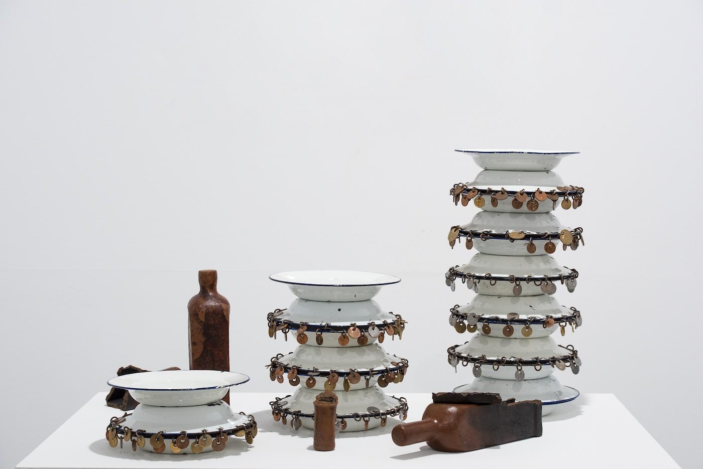 Ishola Akpo, Erou Kékéré I, 2022. Painting on enamelled dishes. Variable dimensions. Courtesy of the artist and Sabrina Amrani.
