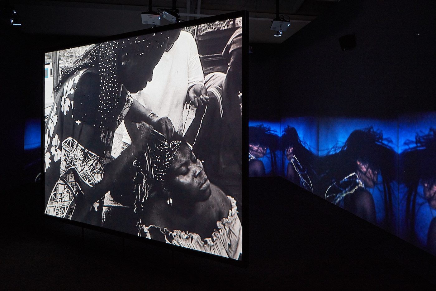 Akosua Adoma Owusu is a Ghanaian-American filmmaker in the broadest sense. She thinks and presents her work in the large scale format that cinema requires. Her subject matter is a hybrid of political and deeply intimate narratives around how we see Blackness and how Blackness is misrepresented, appropriated, and negated. In collage style, she creates stories by mixing local cityscapes with salon interiors and the movement of bodies between those spaces. To see her pieces on display in an institutional environment such as San Francisco’s CCA Wattis Centre for Contemporary Arts, is in opposition to the moments of intimacy captured, such as children falling asleep while getting their hair braided, or a woman sitting in a salon chair in hair rollers. We want to be closer to the screen and the scene, to be a part of the story, touched by the crackle of the audio in Split Ends (2012) which won the Tom Berman Award for Most Promising Filmmaker at Ann Arbor Film Festival or to be a part of the crowd in Pelourinho: They Don’t Really Care About Us (2019).