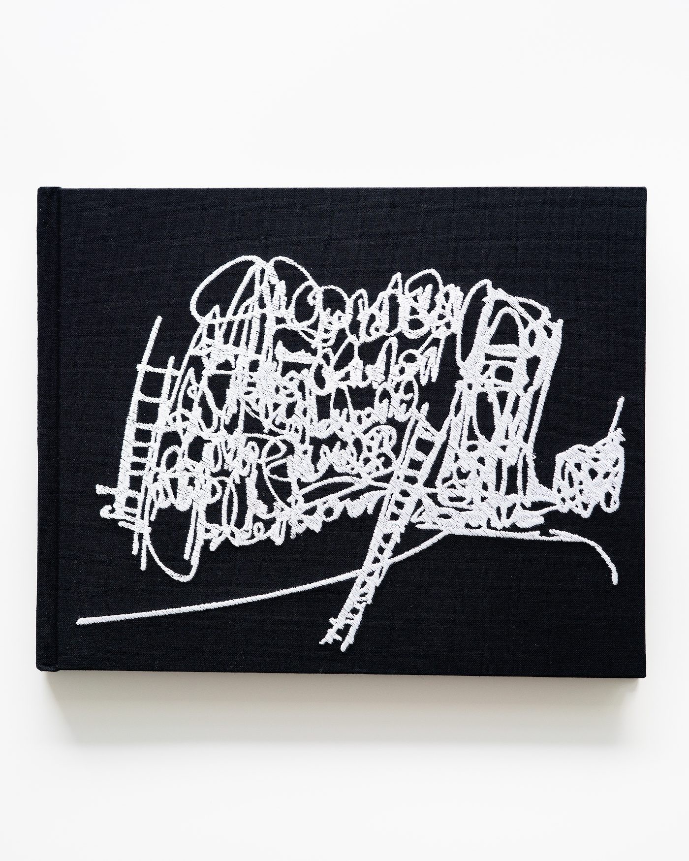 Before beginning the tender gesture of opening the nacreous pages of One Long Black Sentence, I succumb to the textural delights of pale stitching on black cloth. Running my fingers over the embroidered meaning, I am reminded of Nasreen Mohamedi’s words: “each wave a destiny which ends in one breath.” This is the genesis of that sentence – that long black sentence.