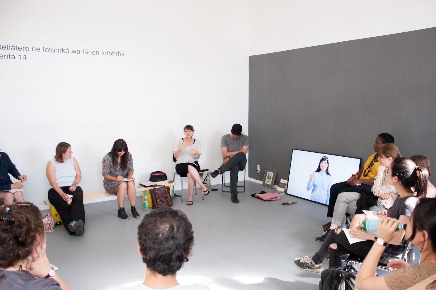AtSBC Gallery is currently on view the Fourth Gesture of the exhibition: Wood Land School: Kahatenhstánion tsi na’tetiatere ne Iotohrkó:wa tánon Iotohrha/ Drawing Lines from January to December.