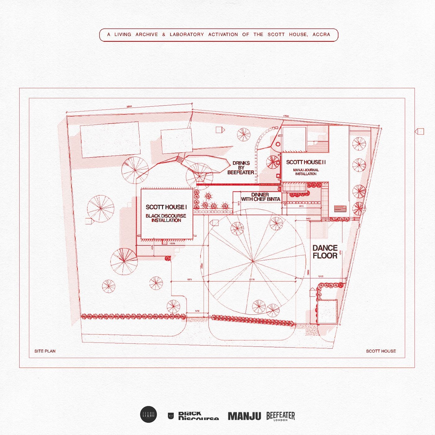 This approach also informs how preservation shows up in ARCHITECTURE IS A PARTY. “The question is how can we activate all these carcass-like spaces in Accra, in Ghana,” Petit-Frère tells me. Her relationship with the Scott home began with curiosity. Always keeping her eyes open for stories that spaces keep hidden, she was drawn to its bold modernist style and its place in Accra history. Over several months, Petit-Frère got to know the second and third generation descendants of Kenneth Scott and during that time an idea took shape. It was about an event that would bring Ghanaian spatial practitioners and practitioners across the Diaspora together. Three weeks before the launch of ARCHITECTURE IS A PARTY, she was introduced to Zion Estrada and Koumbah Semega-Janneh, the creative directors of the curatorial platform Black Discourse. “It was just happenstance that I was already planning to be in Accra for December,” says Estrada. “So it was a really beautiful connect-the-dots of meeting folks that are active internationally and working with diasporic and Pan-African conversation and archivism.”