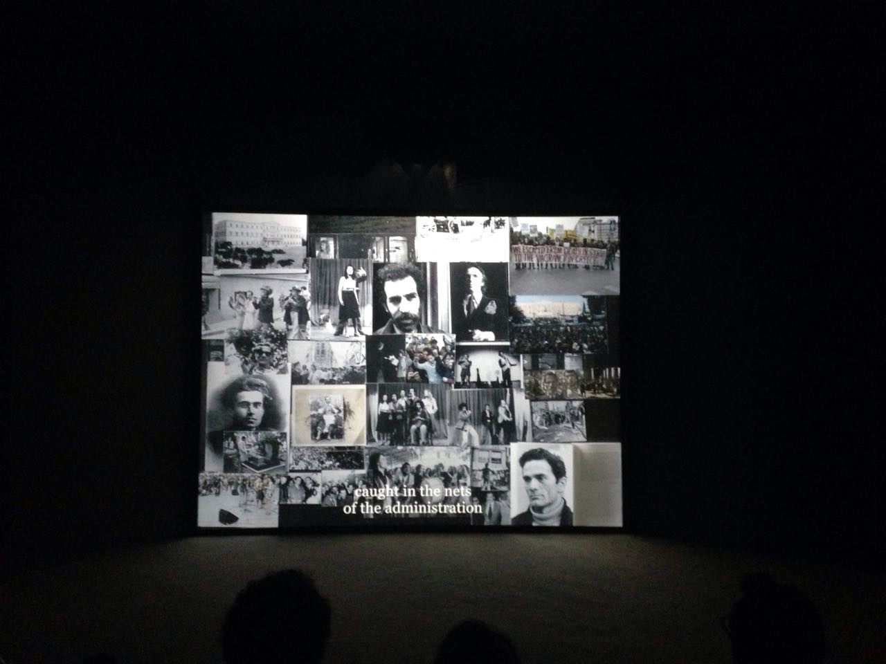 <figcaption> Bouchra Khalili, installation view The Tempest Society (2017). Digital film, color, sound 60 min. Produced by Bouchra Khalili and Alexandre Kauffmann. Coproduced with Ibsen Awars´ds, Ibsen Theater, Skien, Norway. With the support of Foundation National des Arts Graphiques et Plastiques, Paris, and the Holland Festival, Amsterdam. documenta 14 in Athens, 2017. Photo by C&