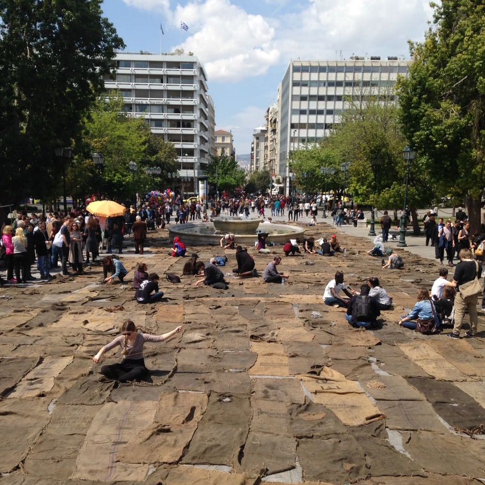 <figcaption> Ibrahim Mahama, Installation view Check Point Prosfygika. 1934-2034. 2016-2017. Performance with charcoal sacks, scrap metal, tarpaulin, metal tags, and Henschel train interior leather. documenta 14 in Athens, 2017. Photo by C&.