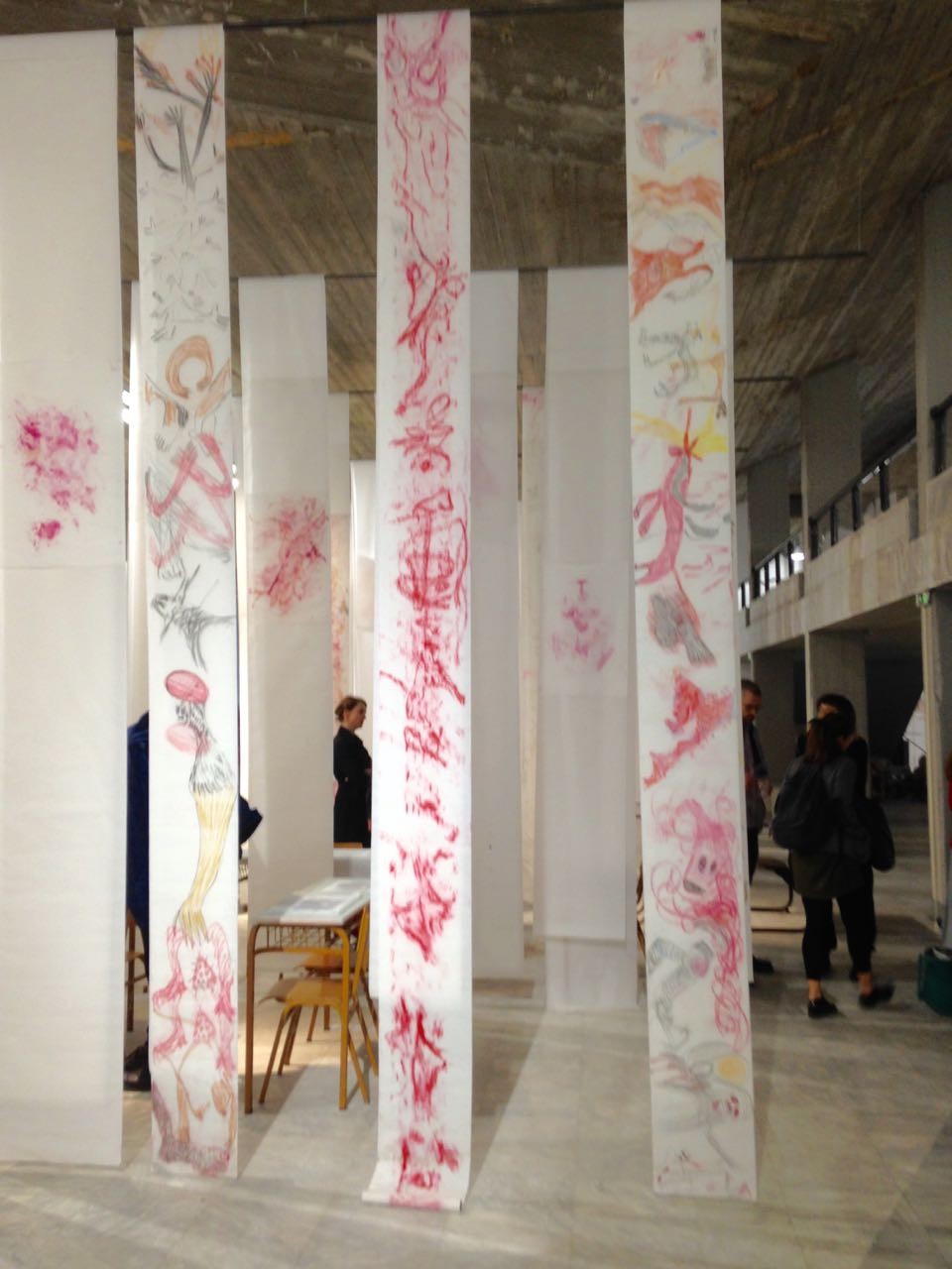 <figcaption> Pégalie Gbaguidi, installation view The Missing Link. Decolonization by Mrs Smiling Stone (2017). School desks, photographs, glassine paper sheets, drawings with colored pencil, microphone stand, earth and lipstick on paper, digital video. Photographs by Dr. Peter Magubane. documenta 14 in Athens, 2017. Photo by C&