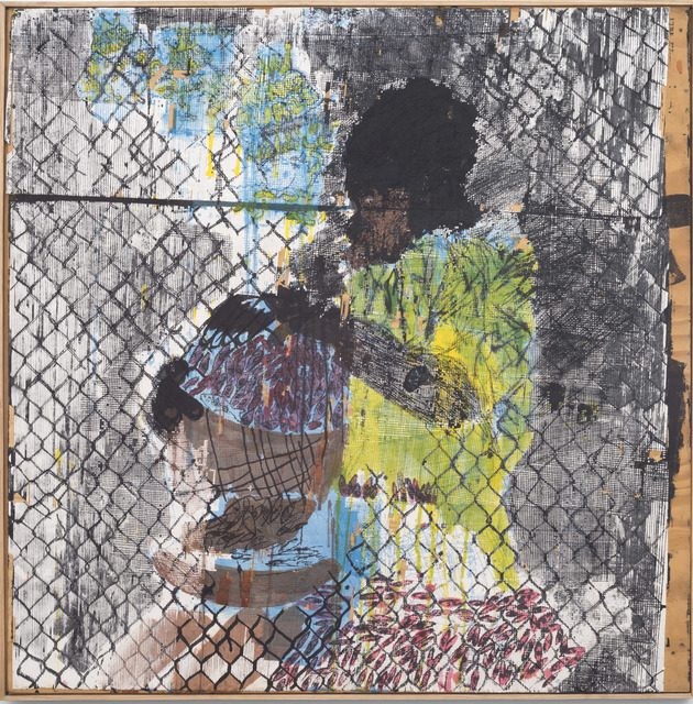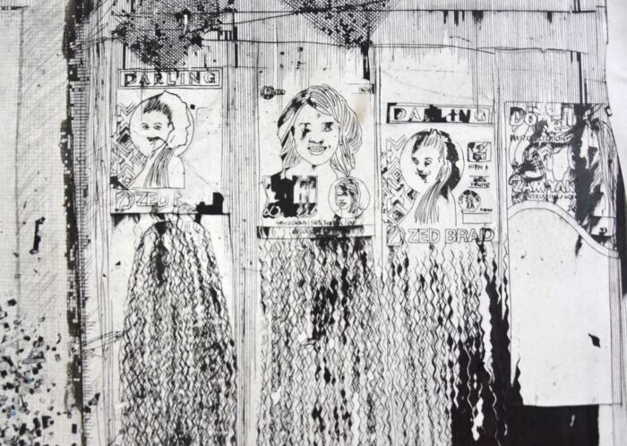 Many of the works in the exhibition have been produced using the artist’s unique kucheka-cheka technique which developed from his training in printmaking. Derived from etching and using sharp blades, Nyandoro draws onto large pieces of paper and sponges ink onto the surface before removing the top layer of paper with tape. Only ink that is trapped …