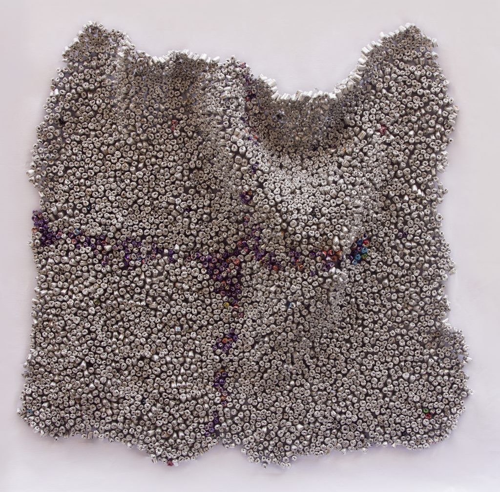 I use different processes in creating my work. One of them is melting plastic into different shapes, such as small nuggets, used to create whatever forms I desire. If I want to create specific shapes like triangles or circular rings, I melt the plastic using a mold which becomes a skeletal frame for the work I am building. These processes can be tedious and boring, but the finished product compensates for the process. Apart from plastics, I started experimenting with newspapers two years ago. I started coiling newspapers and integrating them with discarded electric cables. So for me it’s about trying something new, and finding out what works. This has become an integral part of my visual commentary.