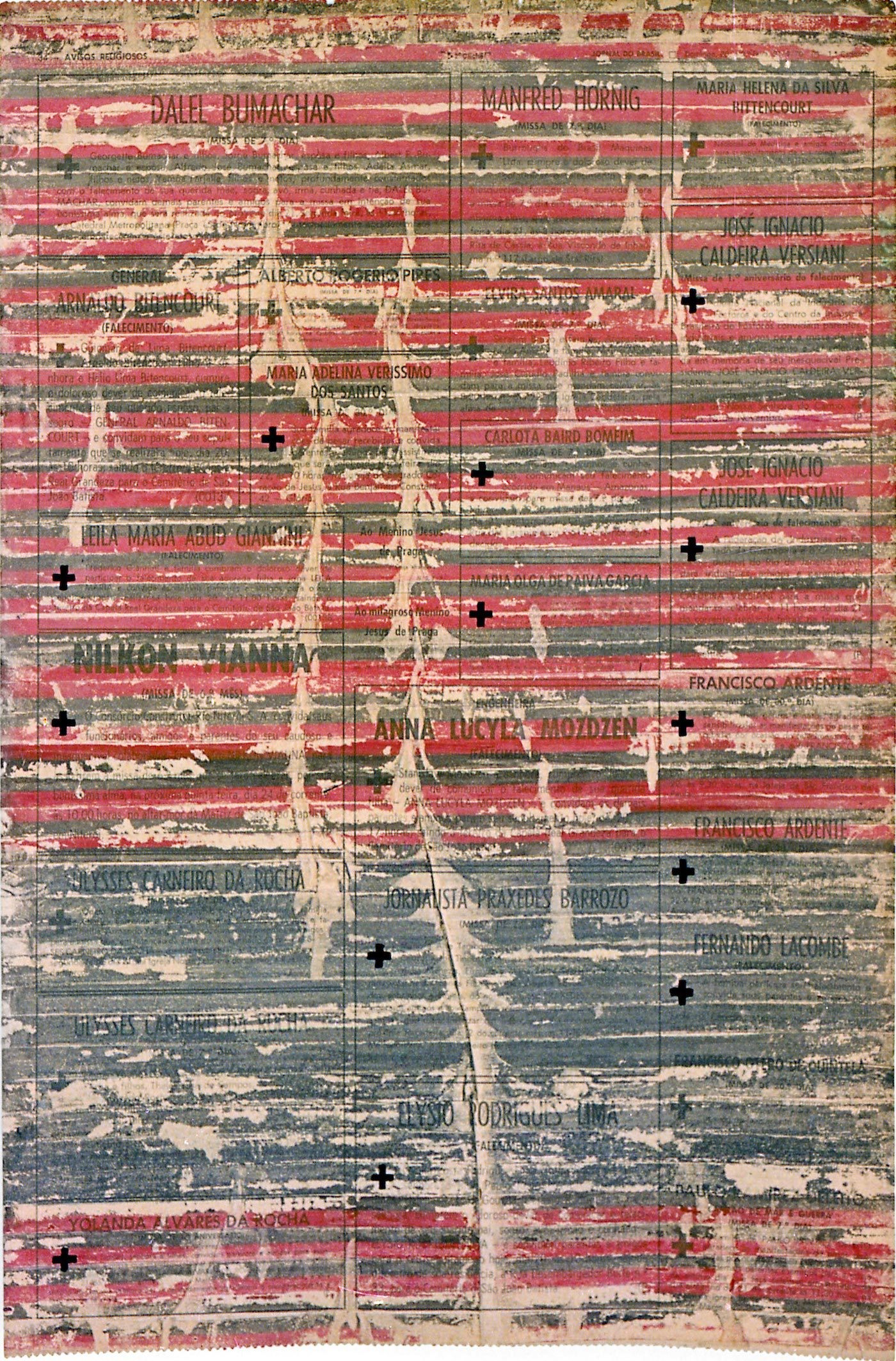 Brazilian artist Ana Vitória Mussi (b. 1943) also employed news in her series Jornais (Newspapers, 1970). News clippings are torn and painted over, and words and images are blocked out, ultimately telling new stories and creating alternative media narratives. The strictly informational purpose of the newspaper is negated here, and through the use of imagination and deconstruction a new medium is produced.