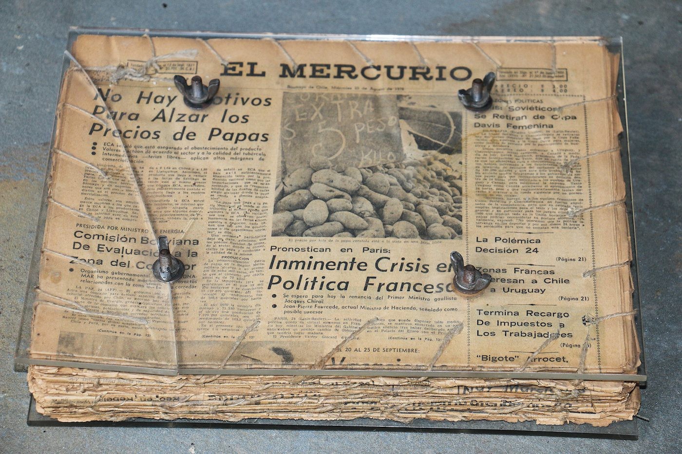 Newspapers have long played a crucial role in the dissemination of state-sponsored propaganda, but when used by Parra and Mussi they became a strategic material to combat the disinformation spread to confuse and frighten targeted communities. Under the venomous rule of Augusto Pinochet, self-taught artist Catalina Parra (b. 1940), subverted the power of text through the use of newsprint, press clippings, and collage. Diario de vida (Diary of Life, 1977) uses El Mercurio newspapers layered between two slabs of plexiglass, a time capsule documenting the suppression of language throughout Chile’s dictatorship and illustrating the pressures of submitting to such force.